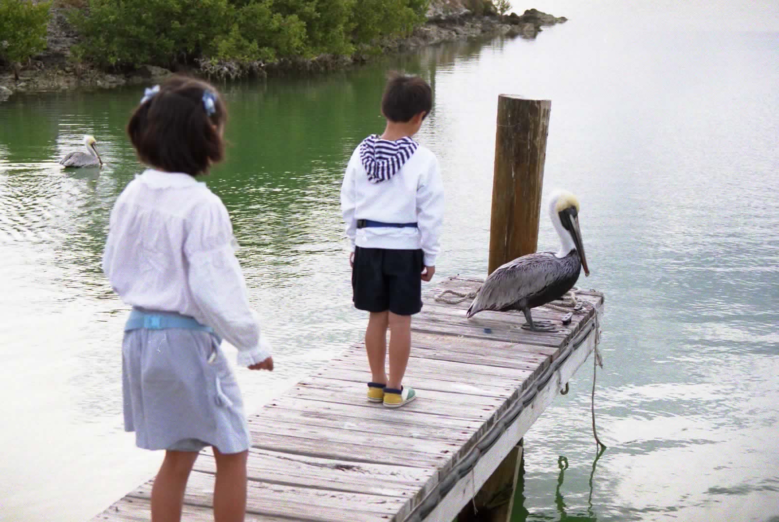 朝食後、ホテルの海辺でペリカンと遊ぶ