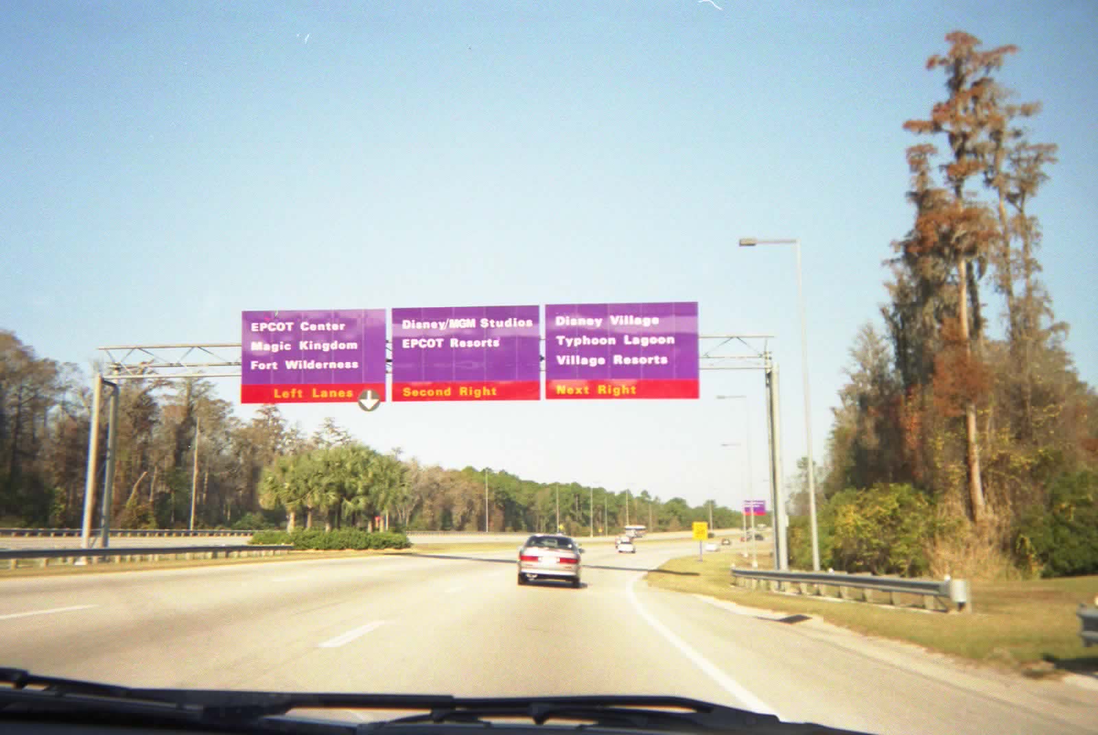 そのうちにディズニー・ワールドへの標識が見えて、その大きな道路に入るとすぐに料金所があった。そこの太った黒人のおばさんに、「これはビーライン・エクスプレス(本当はこの道路に乗ろうとしていた)じゃないよね」と聞くと、どこに行きたいのか聞かれて、ホテルの名前を言っても分からないだろうから、「ディズニー・ワールドに行きたい」と言うと、このまま真っ直ぐ行くように言われた。2回も料金所があって、しばらく行くと、今朝パパと通った大きな交差点でパパがその時「野球場が1つ入るくらい広い交差点だ」と言っていた所に出て一安心した。子供達もこの交差点は覚えていた。