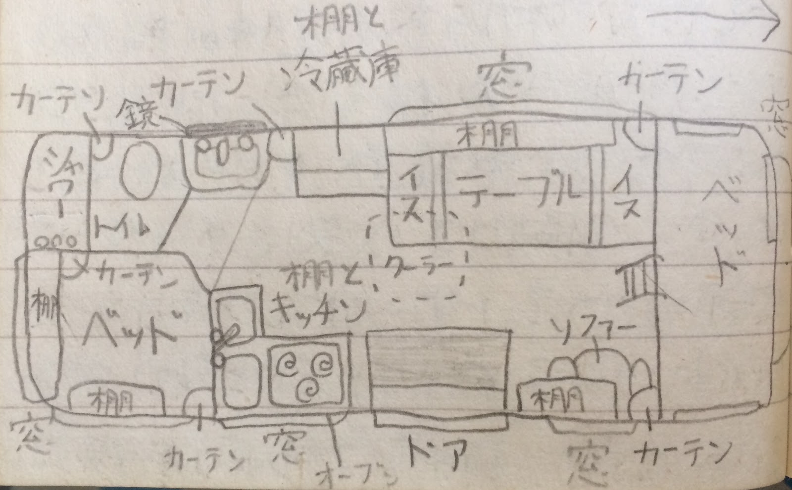 下は、娘が自分の旅日記に描いていたキャンピングカー内部の見取り図です。右端のベッド(2階)の下に運転席・助手席(1階)があります。真ん中のクーラー(エアコン)は天井についています。