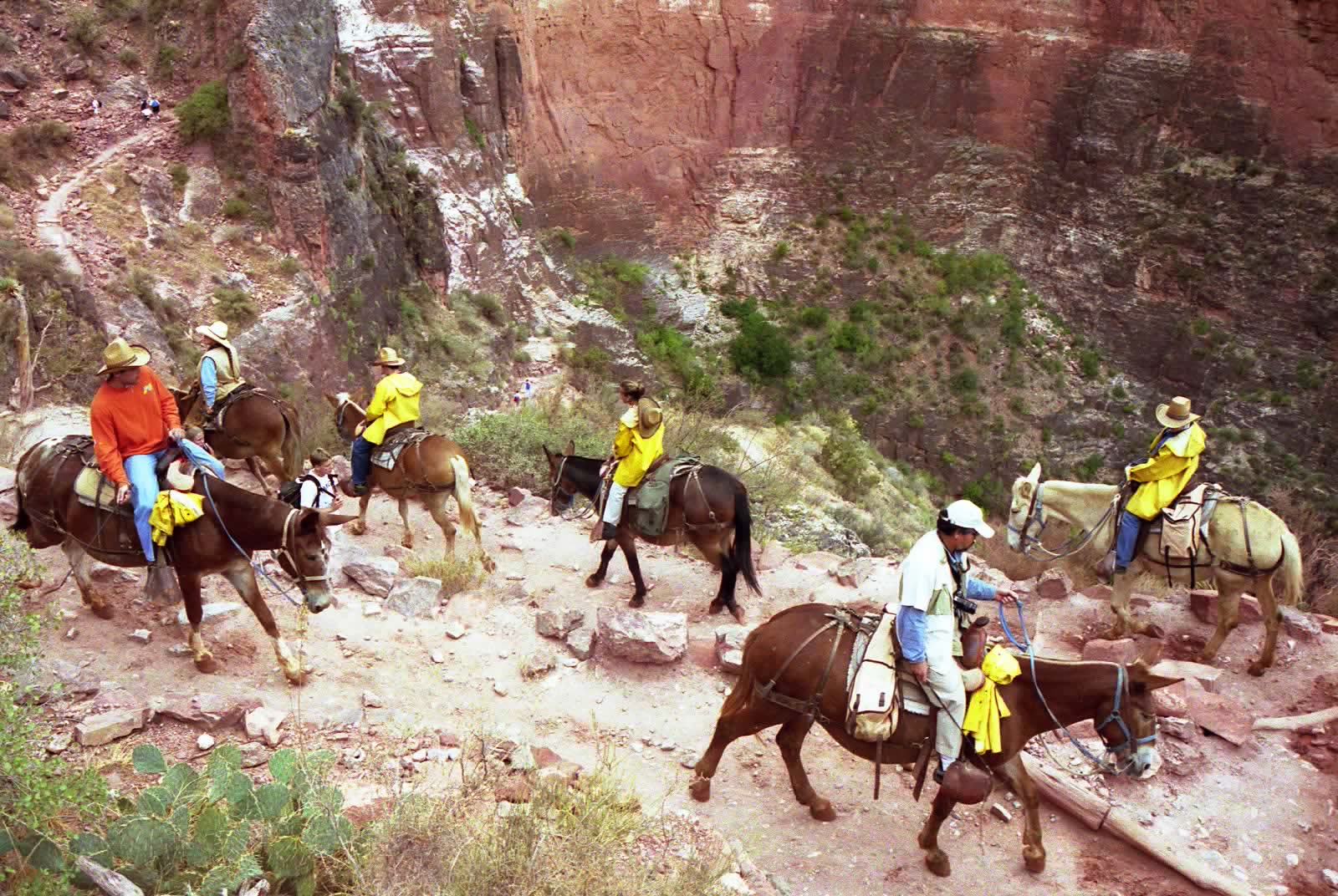 無料シャトルバスに乗ってトレイルの入り口まで行ってみると、ラバに乗って谷底に降りる「ミュールツアー」の客が集まっていました。黄色のポンチョを着ていますが、雨でも行くようです。