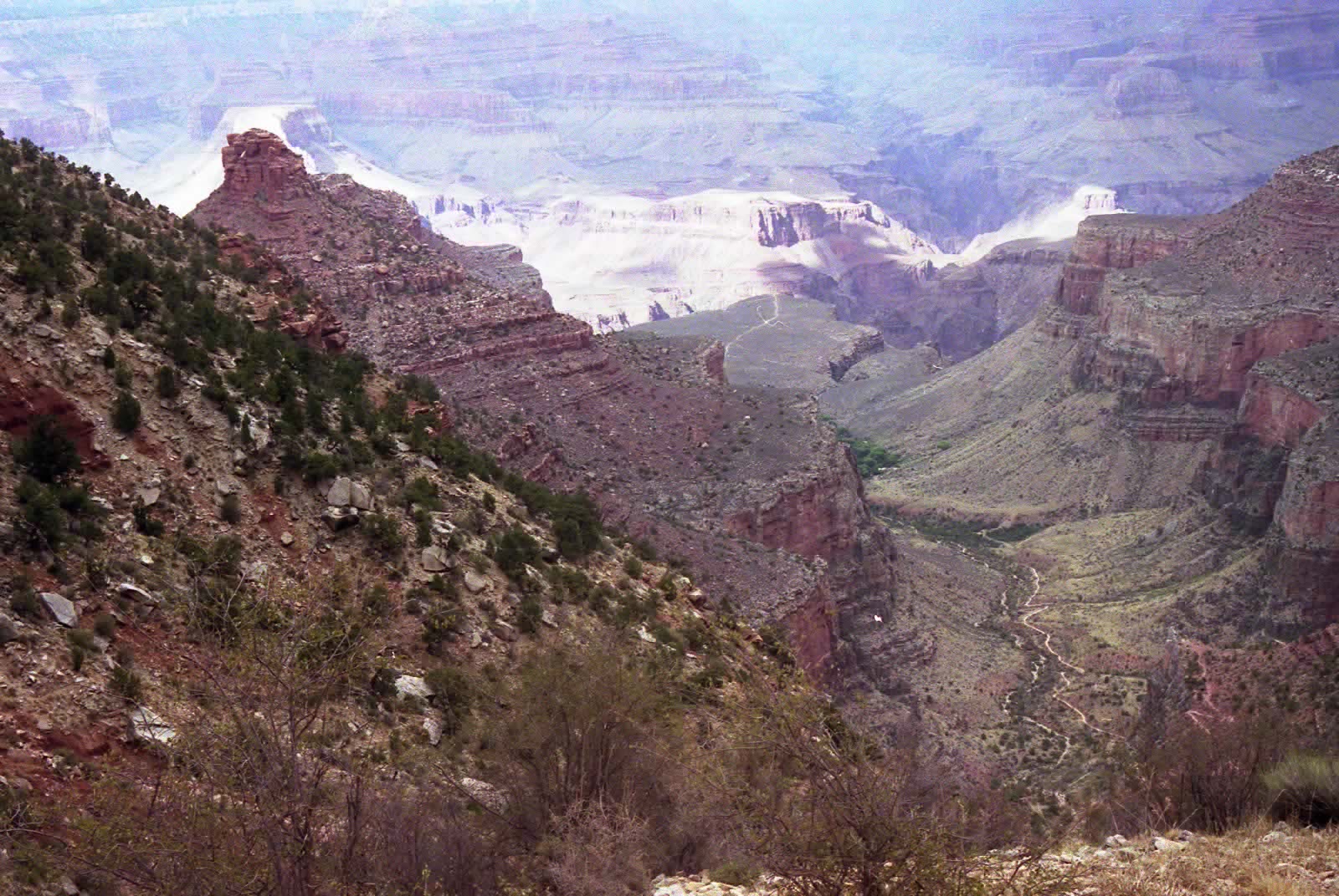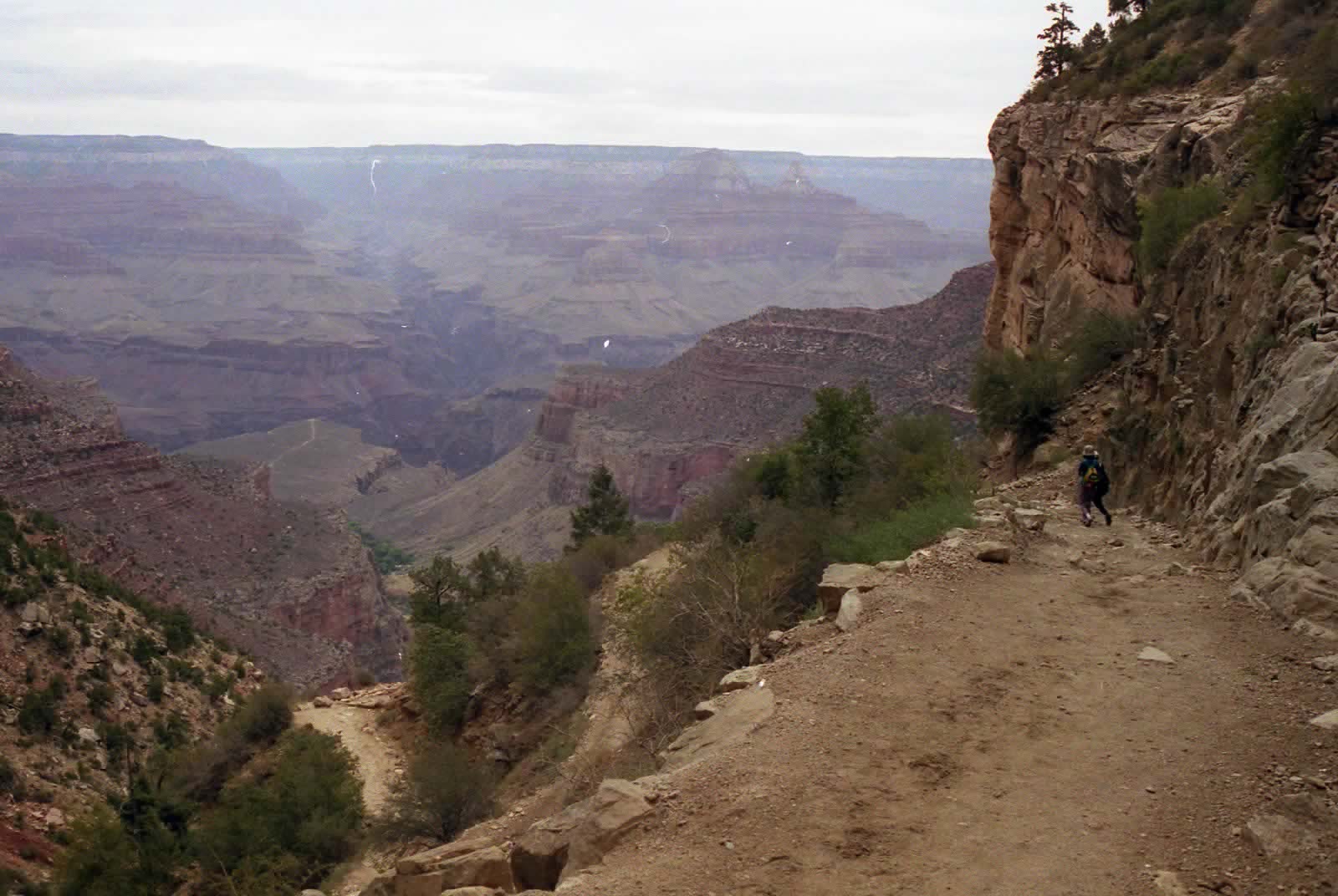 売店のおじさんに天気予報を聞くと、予報は知らないけど、このような天気で涼しいから歩くにはいいと言ってくれました。これで行ってみようと決心して、谷底へ向かう「ブライトエンジェル・トレイル」を、7時半に降り始めました。