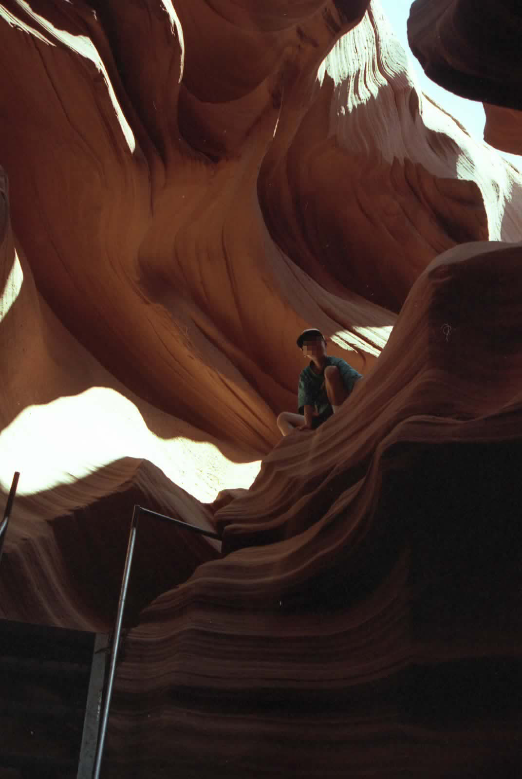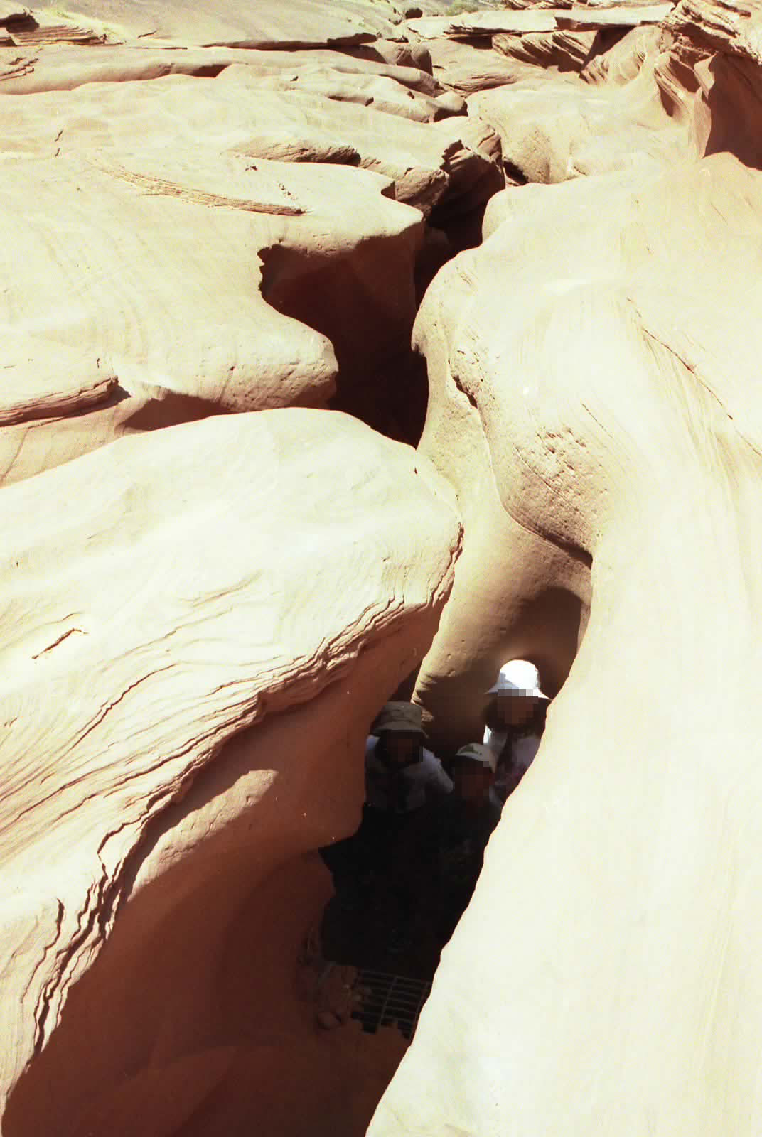 約2時間のドライブで、ようやく「レイクパウエル」の青い湖が見えましたが、まずは、その手前にある「ロウアー・アンテロープ・キャニオン」に立ち寄ります。すごく暑いので、発電機でエアコンを動かしながら、ホットドッグとサンドイッチの昼食を先に済ませました。