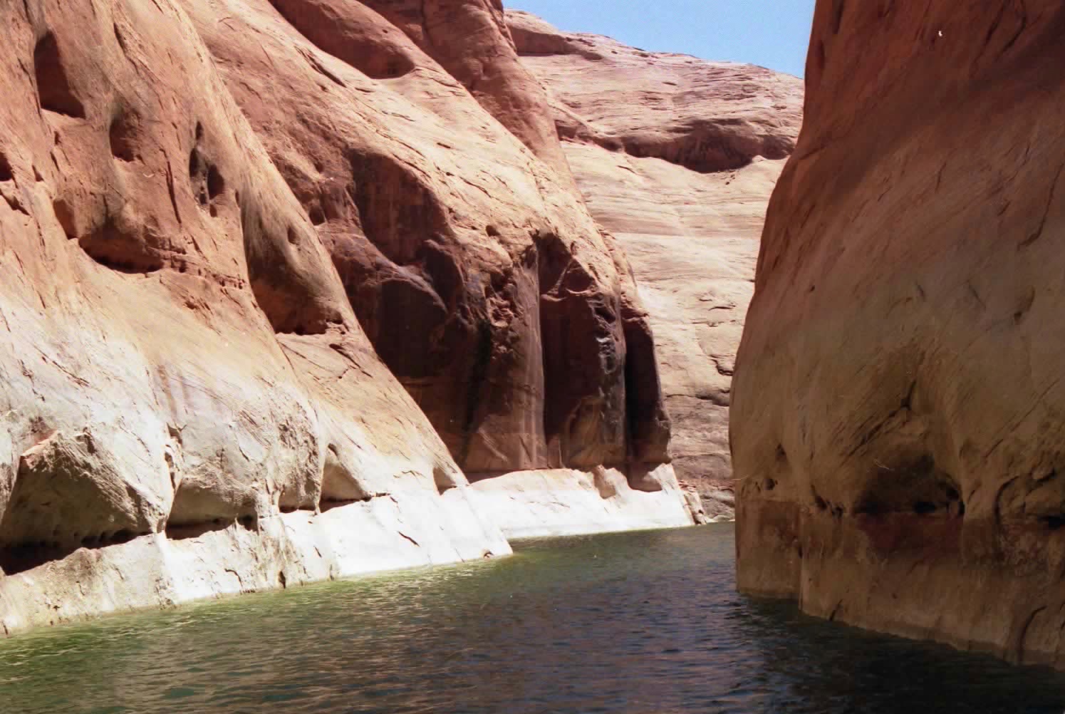 1マイルくらい上流に行った所から、右へ大きく回り込んで、細くてクネクネした「秘密の渓谷」(シークレット・キャニオン)に入りました。ハーバーのボートを説明してくれたお姉さんが教えてくれた場所です。