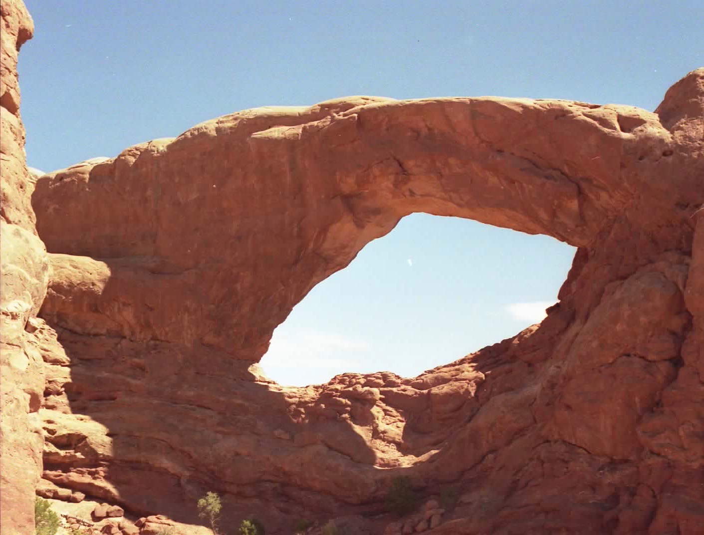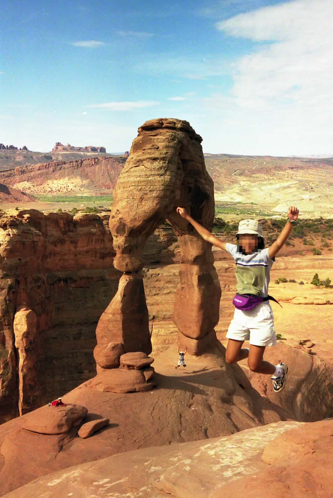 暑い中、何度も水分をとりながら歩いて車に戻ると、息子が、双眼鏡を使えば駐車場からでもデリケート・アーチが見えることを発見しました。