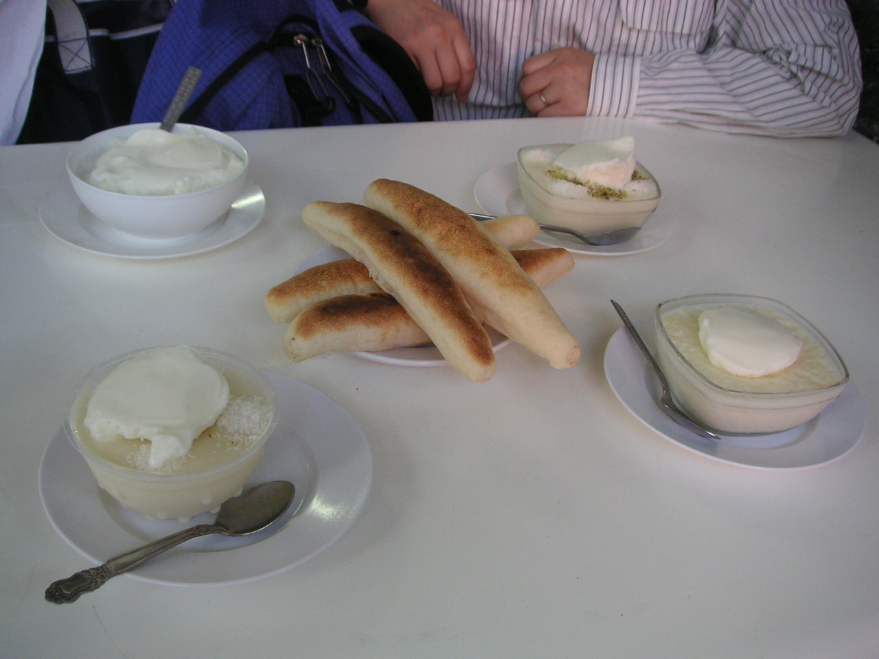 朝食は、800mくらい歩いた所の「地球の歩き方」に載っている店を探して、名前はアラビア語のみで分からないものの、乳製品を3種類食べました。息子の米がはいったのと、娘のは美味しかったけど、親のは甘過ぎでした。