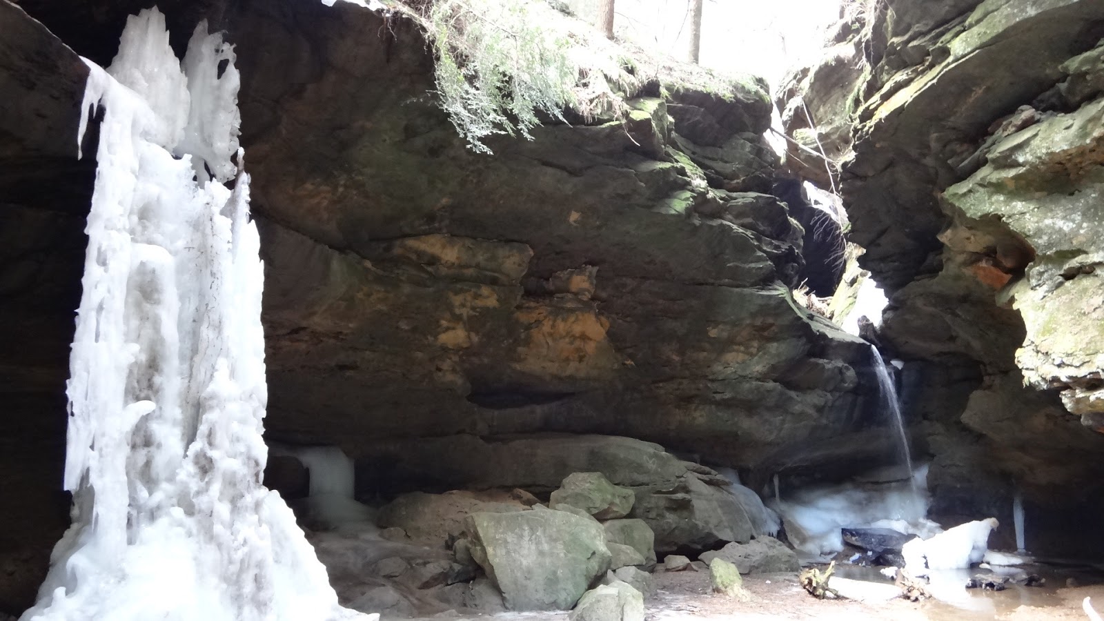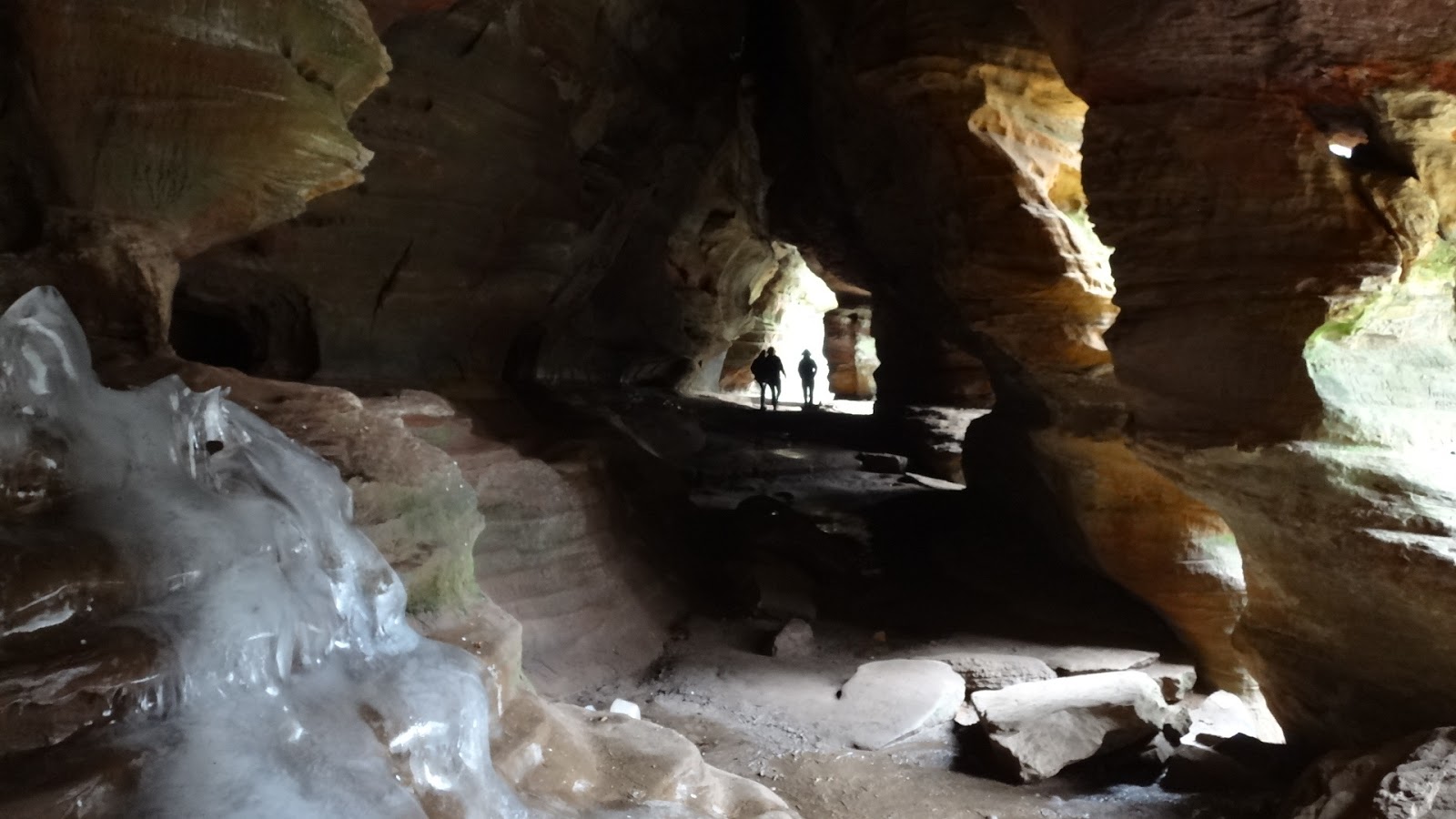 まだオフシーズンで閉まったままのビジターセンターの空っぽの駐車場にポツンとレンタカーを駐車して、両側が崖の狭い渓谷の中に降りて行くと洞穴があり、そこから谷底を下流の滝まで歩いた。
