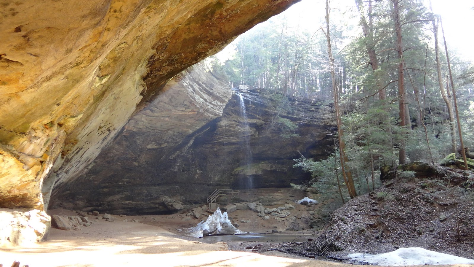 Oldman’s Caveからここまで2マイルのトレールもあって少し迷ったけど、この先のAsh Caveも行きたいし、そこから往復歩いて車まで戻るのでは時間がかかり過ぎるので、見所の間は車で移動することにした。本来の駐車場ではなく、道路脇の小さな駐車場から急な階段を降りて、滝を見て、ぐるりと1周するように歩いた。良い感じの滝だけど、周りに特に何かがあるわけではなく、この滝はこの写真が全て。
