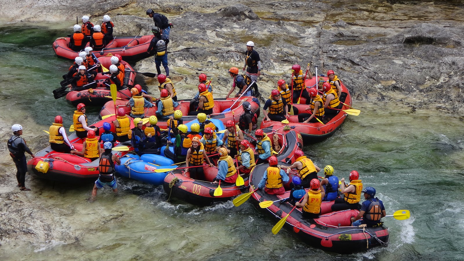 川の中もお盆で大賑わいで、ラフティングのゴムボートがあちこちで渋滞しています。