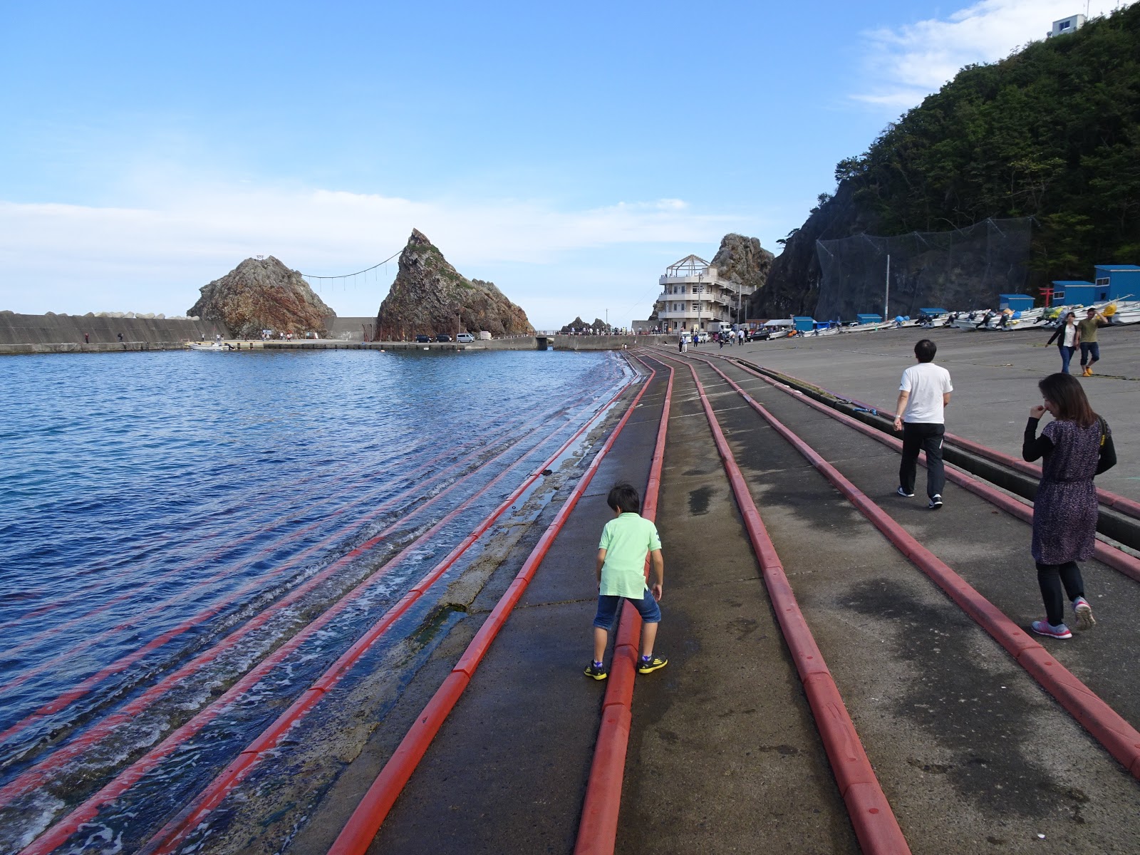次は車で絶景の海岸沿いの細い道を通って、袖が浜漁港のモデルである小袖漁港にやってきました。昨年まではマイカー規制がされていたそうですが、今年は大丈夫です。