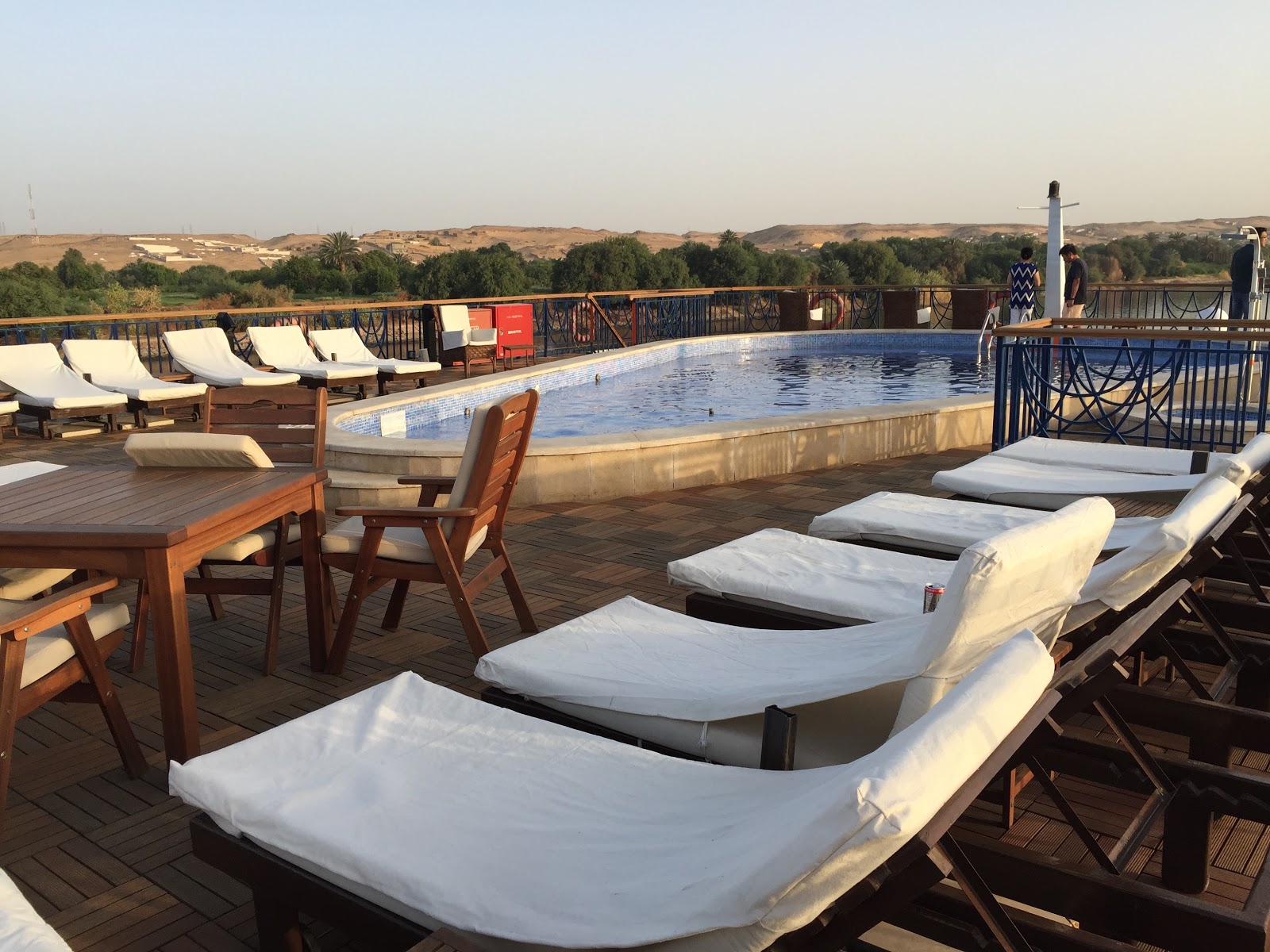 アスワンに係留された船で1泊した翌朝、夜が明ける頃に出航しました。さっそくサンデッキに上がって、涼しくてさわやかな風に吹かれながら景色を眺めました。