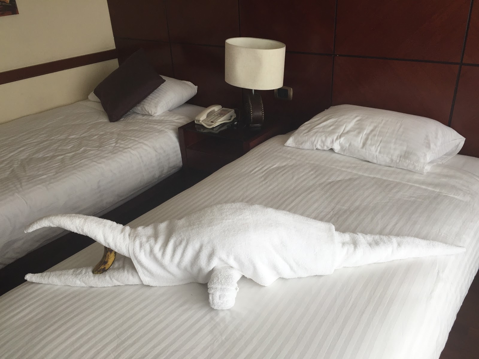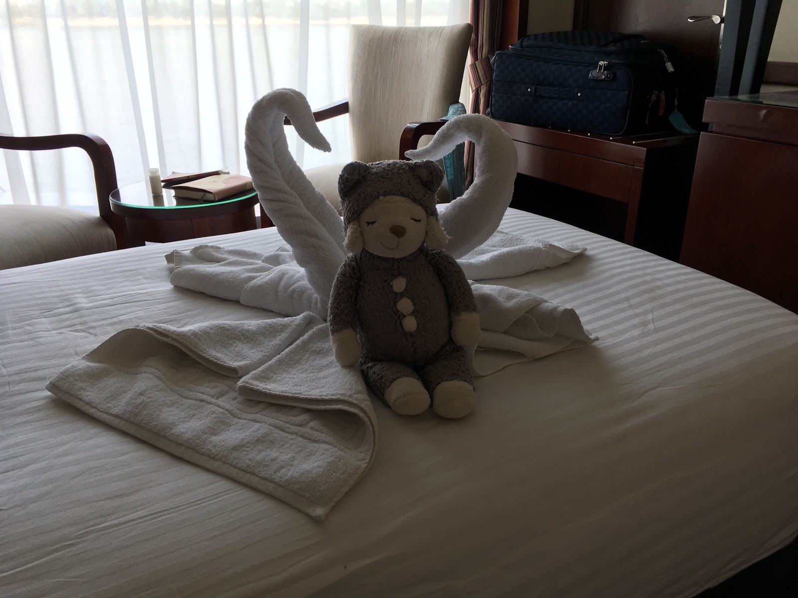 最初の寄港地コム・オンボ神殿の観光をして、船に戻ってくると、バスタオルで作られた2羽のスワンが出迎えてくれました。