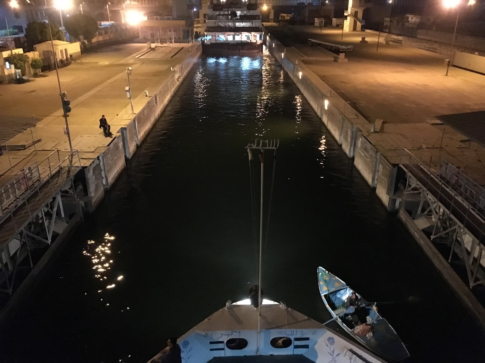 アスワンを早朝発って、2ヶ所の遺跡に立ち寄り、ナイル川を下り続けて日が沈んだ頃、エスナの水門にやってきました。ここでクルーズ船2隻がぎりぎり入るスペースの前後にある水門を閉めて、中の水を抜いて約8mの段差がある下流側の水面まで船を下げるのです。それ自体も興味津々ですが、面白いのは陸から小舟から集まってくる商魂たくましい人たち。土産物を入れた袋を船の上に放り上げてきて、気に入ったら袋にお金を入れて投げ返すという仕組みです。おそらく中には水の上に落ちてしまうものもあるのでしょうが、民族衣装のガラベーヤとかがポンポン投げられてきてにぎやかでした。