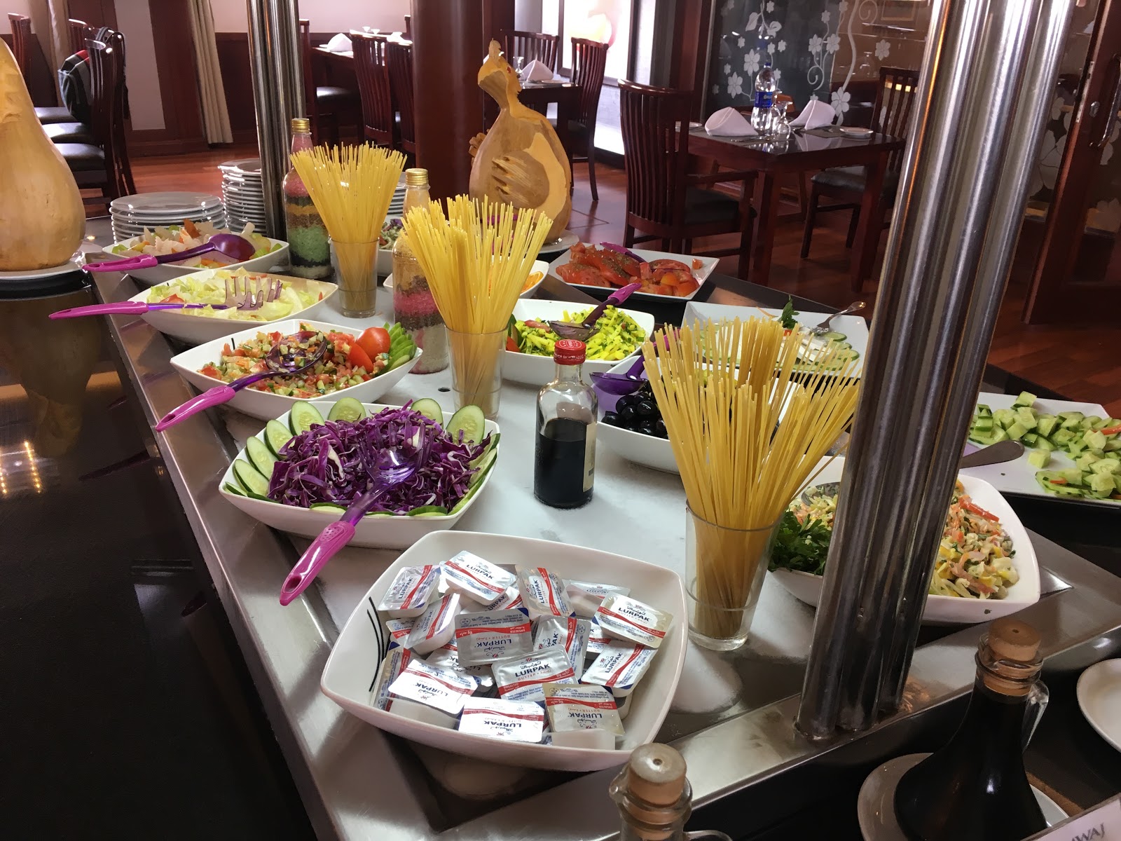 乗船中は、朝・昼・晩3食のビュフェがついています。写真の前菜コーナー以外に、スープ、メインの肉・魚・野菜、デザート、実演コーナーなど一通りあって、毎日内容は変わるので、毎食美味しくいただけました。