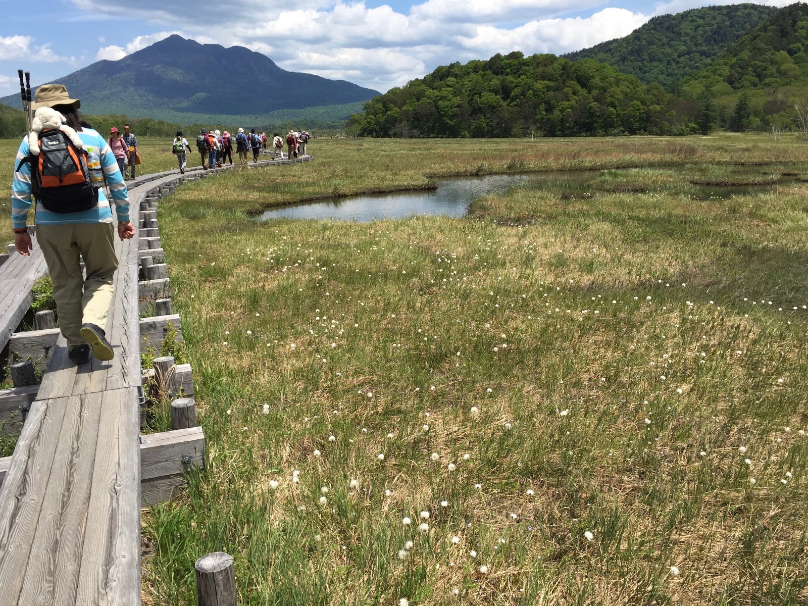 34年ぶりに尾瀬を歩きました。前に来た時はテント持参でキャンプしながら大清水→尾瀬沼→尾瀬ヶ原→鳩待峠と歩いたのですが、今回は鳩待峠から尾瀬ヶ原往復のハイキングです。10時過ぎに鳩待峠をスタートして、尾瀬ヶ原への下り道を3分の2ほど歩いたところで、遊歩道の両側に広がる水芭蕉の群落がありました。