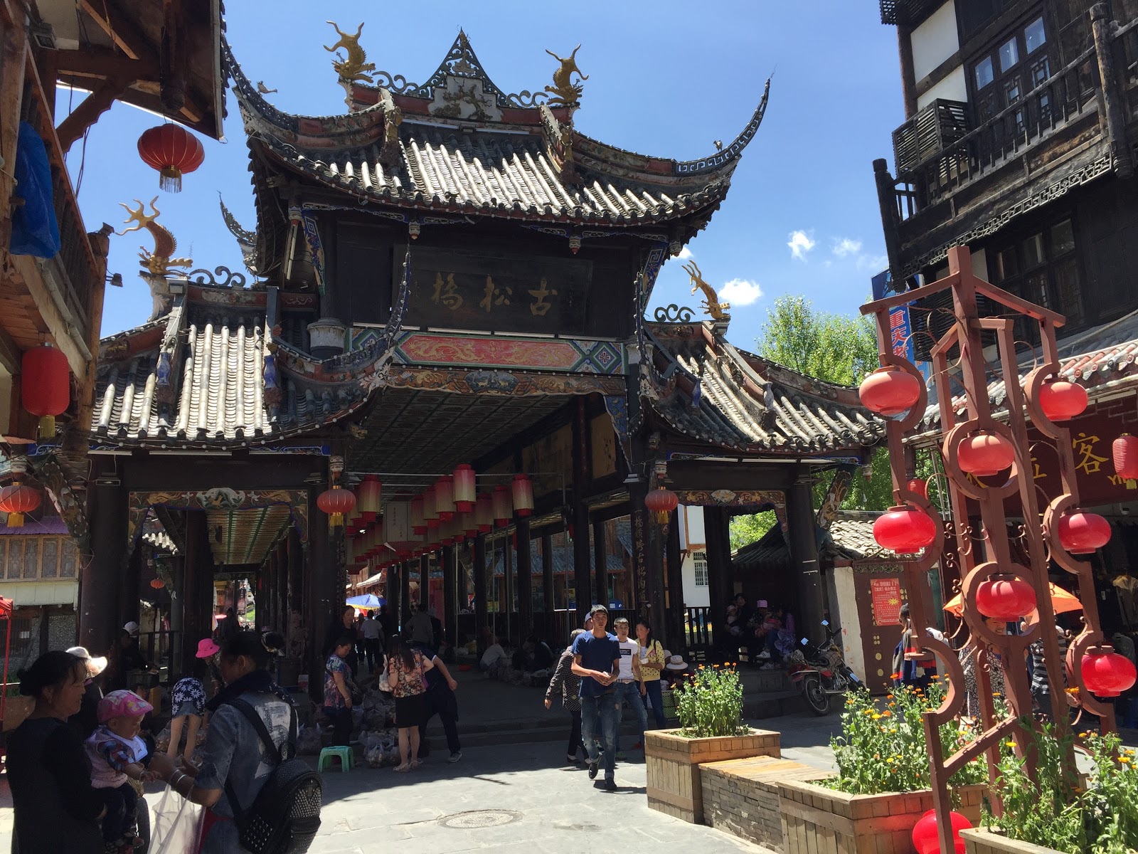 成都から九寨溝に行く途中に通った城壁のある松藩という街が、何となく魅力的だったので、そこに2泊することにしました。九寨溝からバスで2時間半、街の北側のバスターミナルに着いて、城壁の北門から古い街に入りました。ちょうどお祭りをやっているのか、あちこちでにぎやかな飾り付けがなされています。