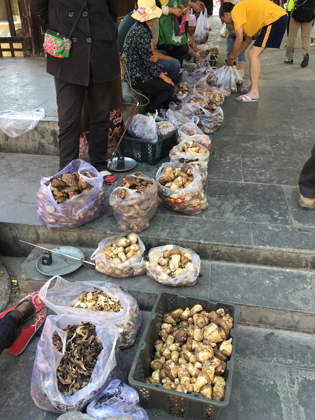 橋の上には、松茸を売るおばさん達が両側にずらりとひかえていました。この近くでは松茸がたくさん採れるようです。乾燥した姫松茸500gくらいを100元(約1500円)に値切って買って、帰国後にお吸い物に入れてみましたが、大変美味しくいただけました。