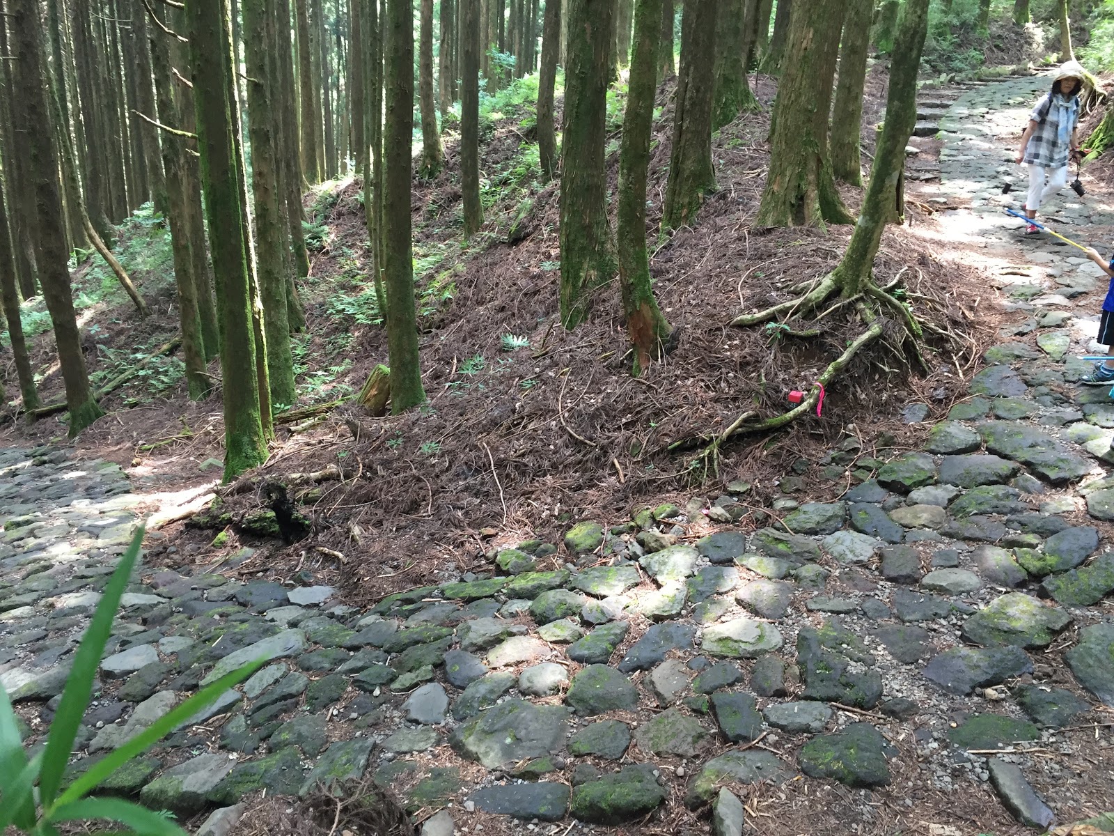 杉並木が終わり、芦ノ湖を離れて権現坂という坂道を登りますが、その後は、ひたすら下り坂です。石畳道が多くて、苔むした石はハイキングシューズでもよく滑りました。むしろこういう所はワラジの方が滑らないのではないかと思います。箱根宿と畑宿の境の目印の大岩がある天ヶ石坂(てんがいしざか)という急坂を下り、石畳道が写真のようにくねくねと続きます。