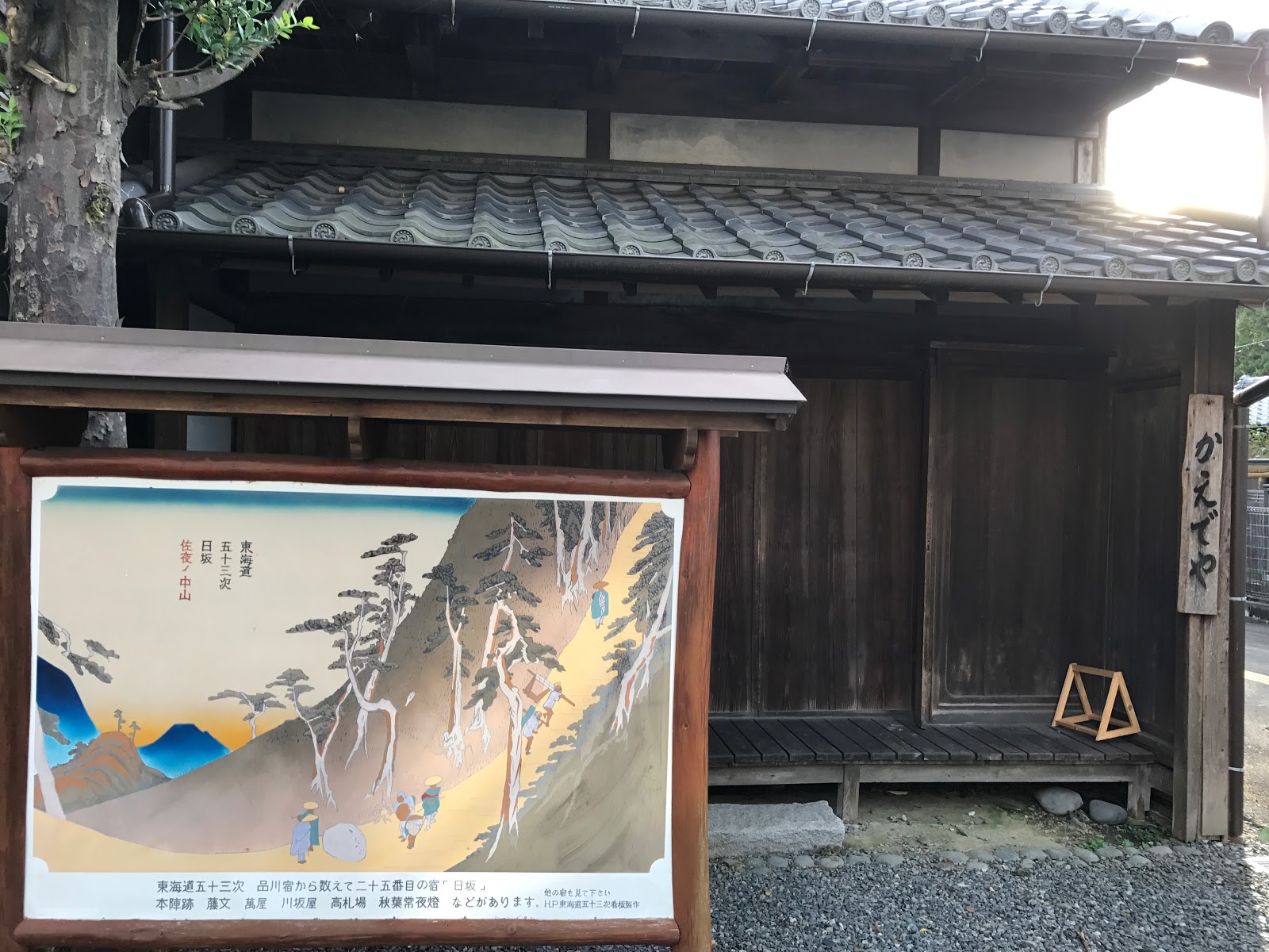 これまで旧東海道を歩いてきた中で一番の急坂ではないかと思われる二の曲がりと言われる所を降りると日坂宿です。とても小さな宿ですが、古い建物がいくつも残っていて、とても良い感じの街でした。広重が描いた日坂の浮世絵にも、小夜の中山の急坂が描かれています。