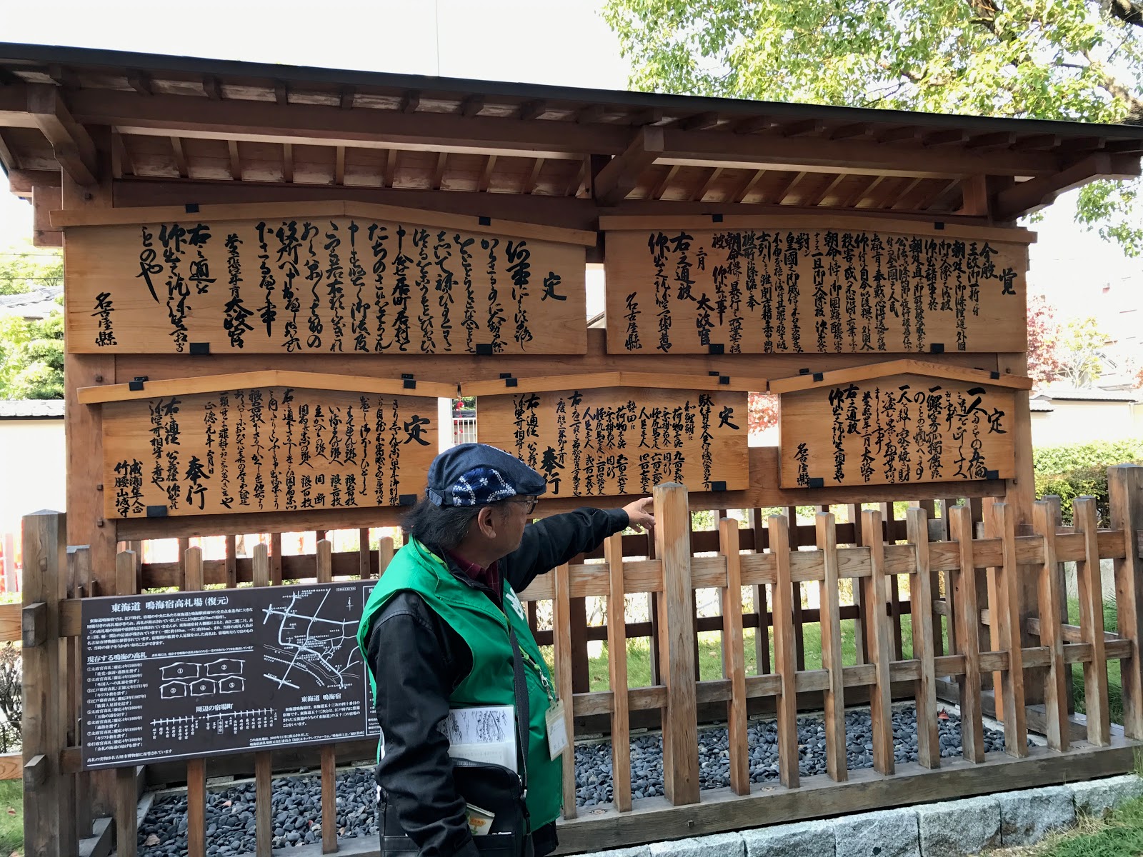 鳴海宿まで来ると、ここでもガイドの方が、何かのツァーのグループに、宿場にあった高札場の説明をしていました。これまで歩いてきた宿のあちこちで、高札場を再現したものはよく見かけましたが、幕府が決めた御法度や掟書を庶民に通達するために人目に付きやすい所にかかげたものです。