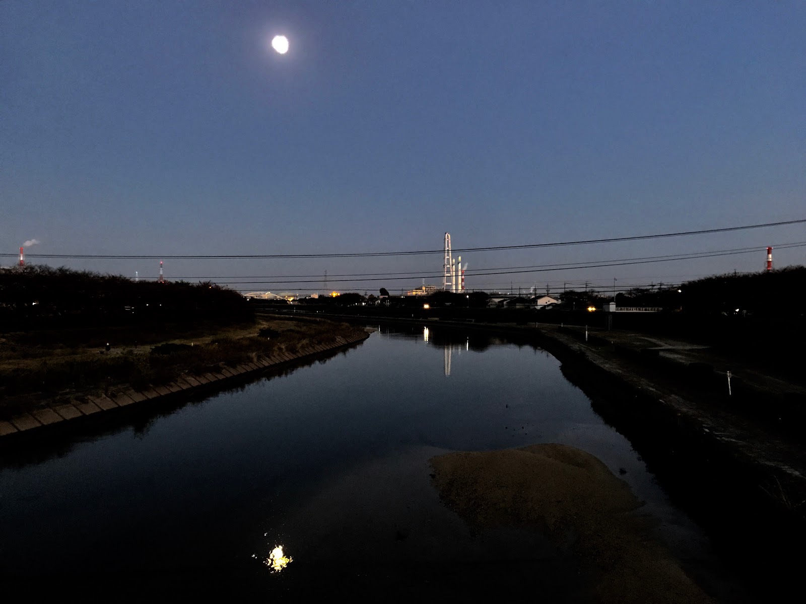 日が暮れてから四日市宿に入りました。満月に近い月がきれいでした。18時にゴールの四日市駅に到着です。