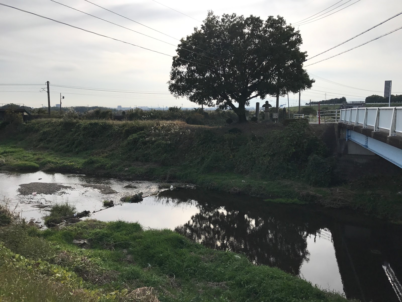 102番目の一里塚は、100番目がこれだったら良かったのにと思えるくらい、素敵なロケーションにありました。川の手前側の土手もとても良い感じだったのですが、対岸の大きな木の根元に一里塚があります。その木陰でしばらく休憩しました。