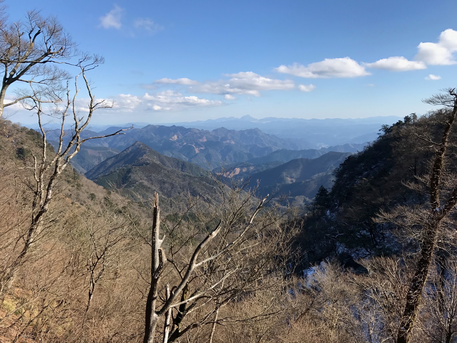 滝から南岳に直登するルートは、雪や氷や岩場もある急斜面で、よじ登るような所も緊張する所もありましたが、それだけとても印象的で思い出に残る山登りができました。13時近くになってお腹を空かせて南岳山頂に到着し、ポカポカした陽だまりでお昼にしました。お腹を満たした後、アイゼンを付けて滑りやすい急な北斜面を降り、雪が溶けて泥々の南斜面を登って、中岳山頂に到着。空気が澄んでいて、山並みのパノラマがよく見えます。一際目立つ山は、16年前にやはり親子三代で登った由布岳です。