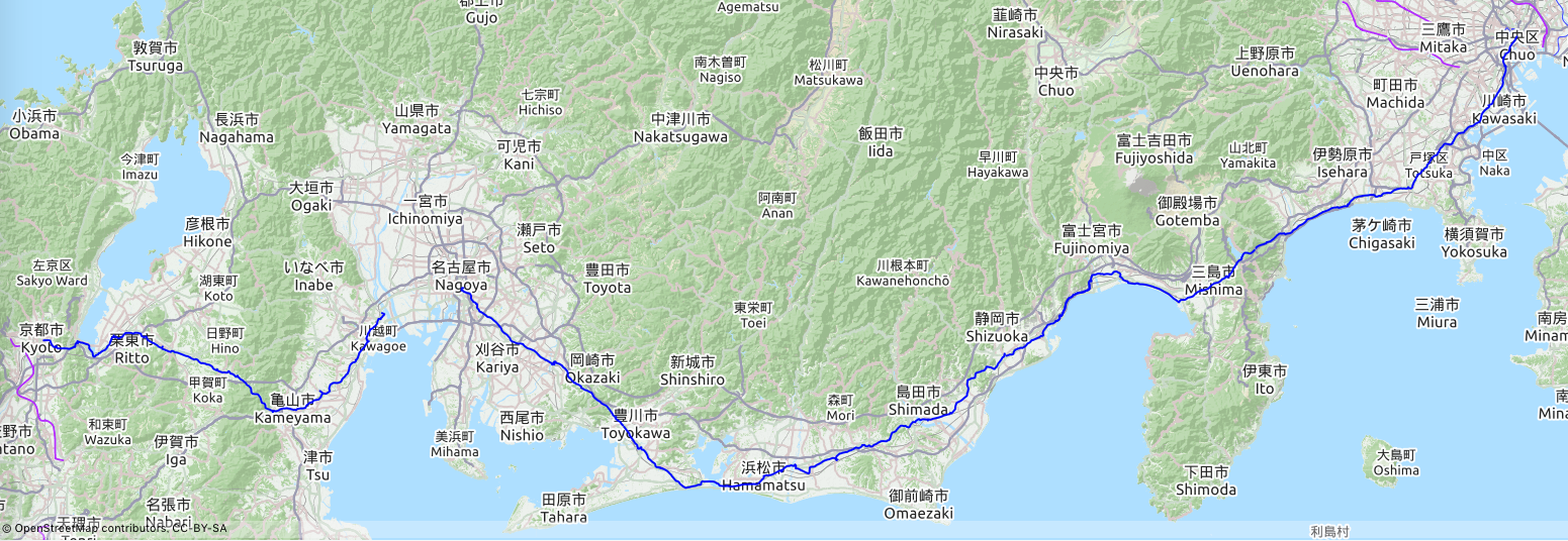 名古屋あたりで線が切れている所は、当時「七里の渡し」と呼ばれた海路の部分です。