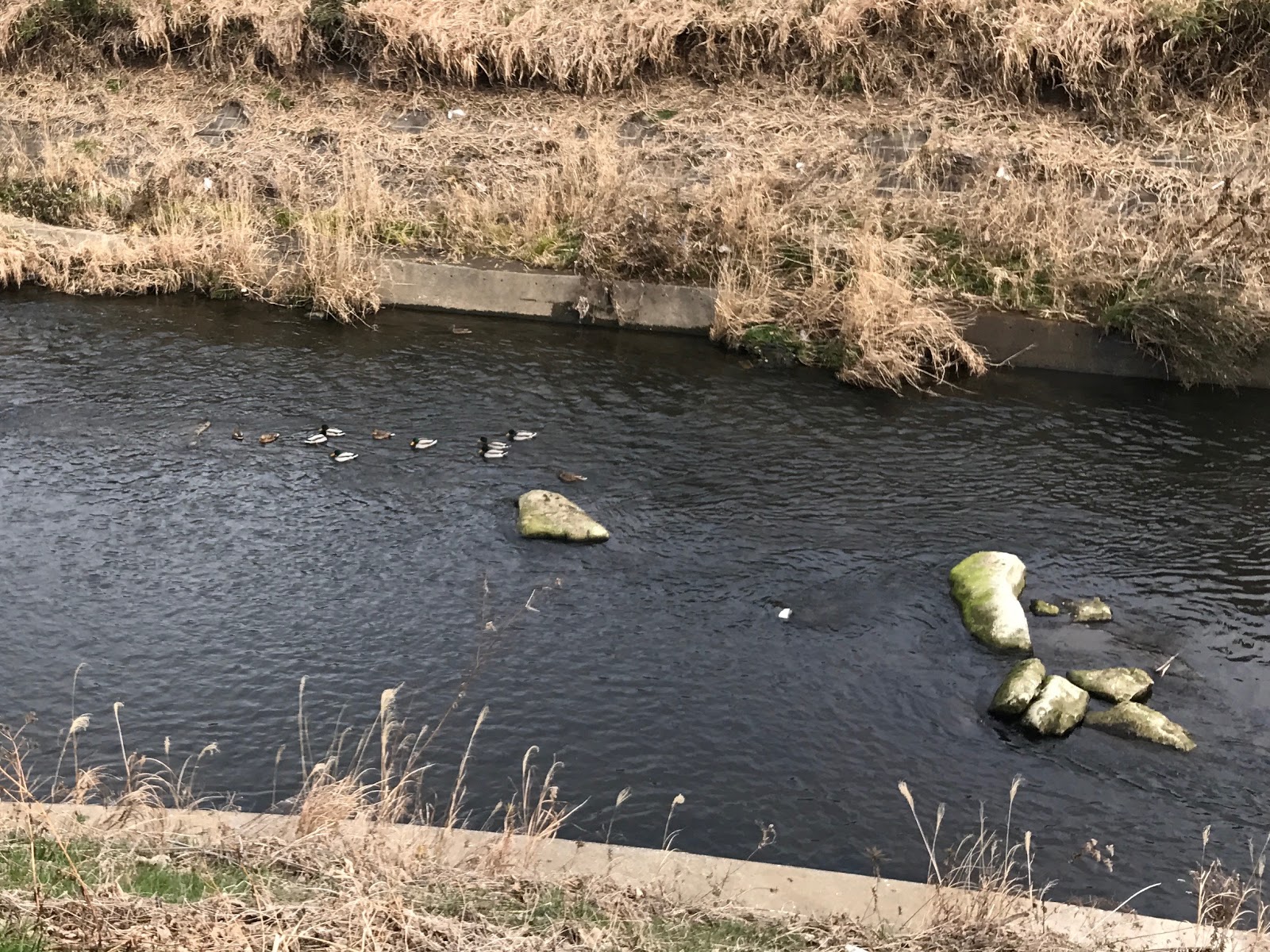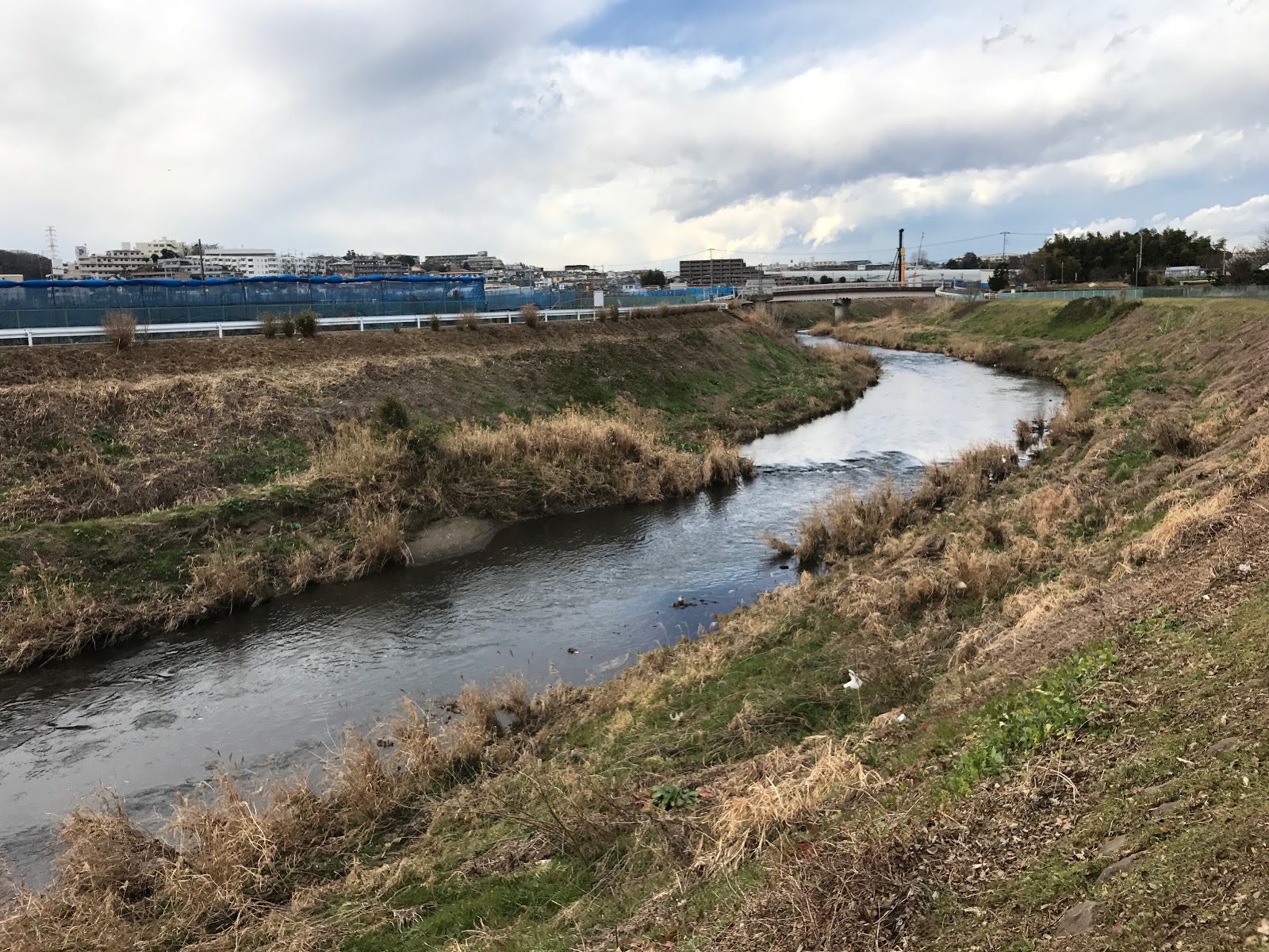 鶴見川を源流から河口まで3日間で歩く予定ですが、今日はその中流域を自宅からJR横浜線の鴨居駅まで20km歩きました。いくつもの支流と合流しながら川幅が段々広くなっていきましたが、写真は今日最初の合流点で、左が鶴見川、右が真光寺川です。ここまでは自宅から時々散歩で来ていた所です。ここから下流側は、今日初めて歩きました。