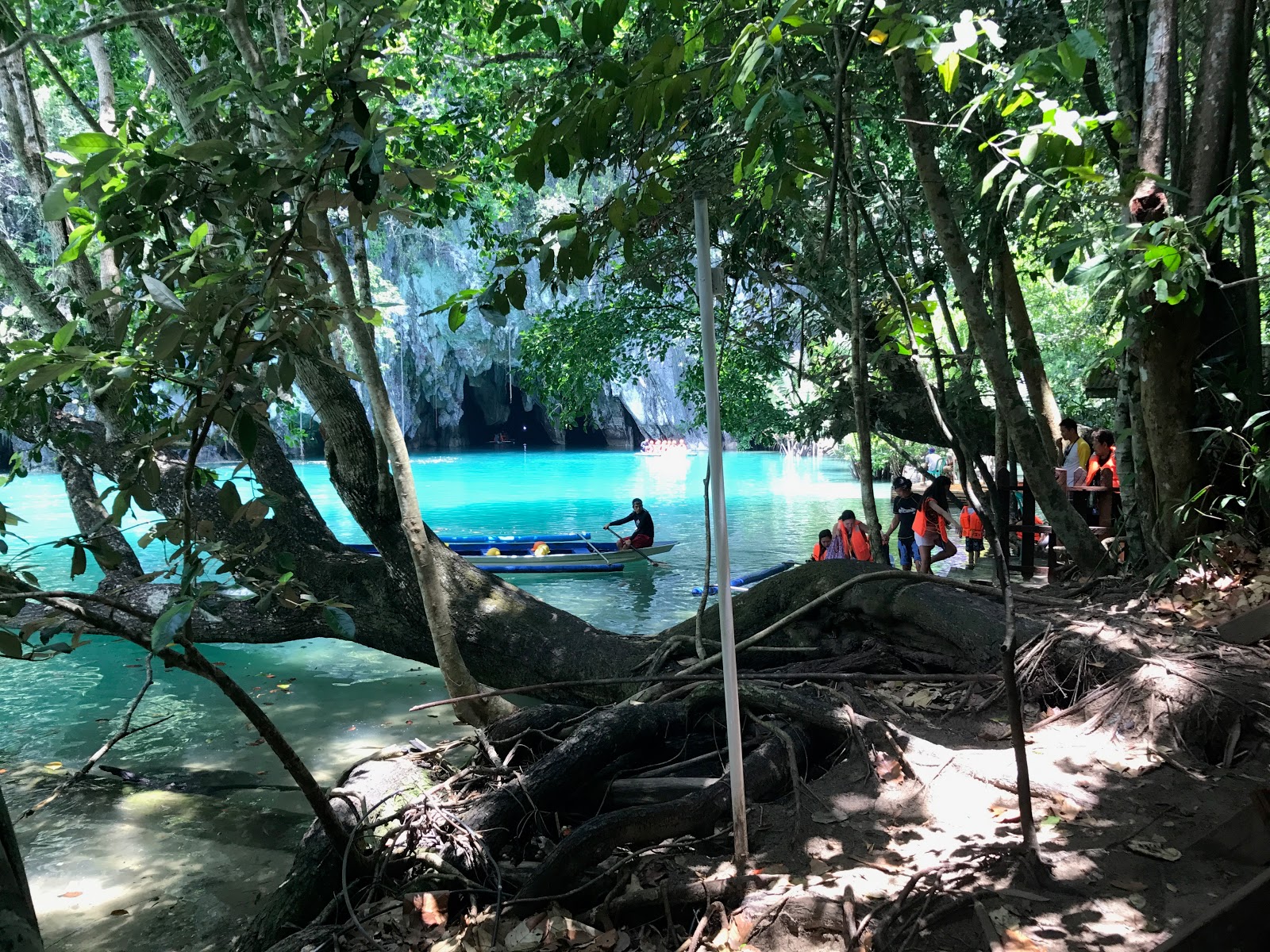 地底河川の入り口へは、船に乗って降りたビーチから、ジャングルの中のような所を少し歩き、洞窟に入って行く10人乗りくらいのボートの順番待ちをします。