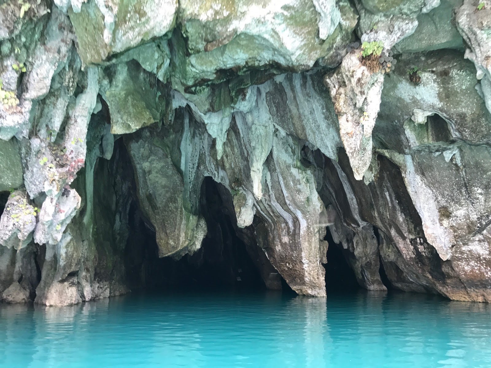 一通り見て洞窟から出るところです。洞窟内は、2隻のボートがすれ違えるくらいの幅はあります。