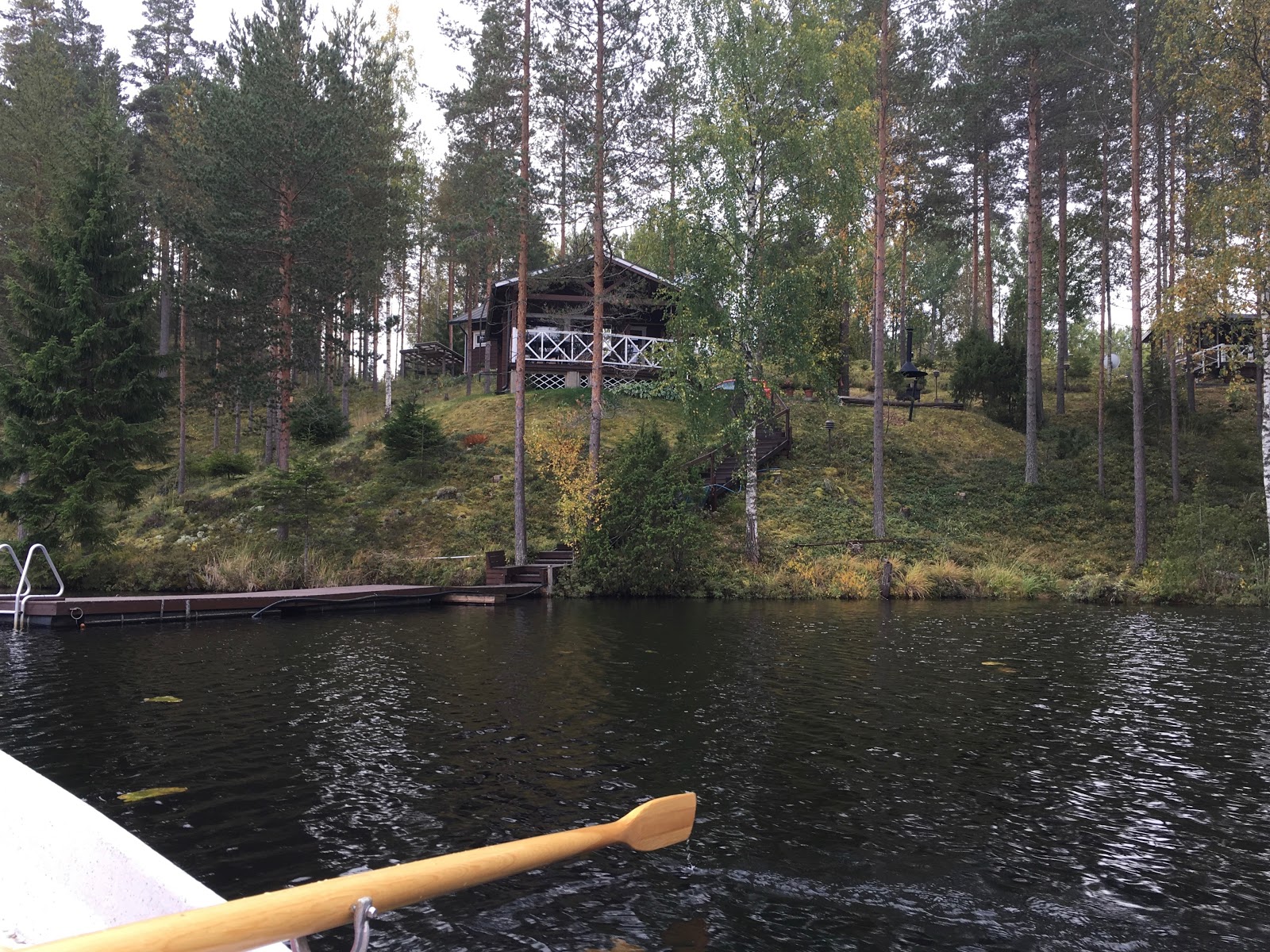 10時過ぎまでベリー摘みをした後、別荘に備え付けのボートで湖に漕ぎ出しました。写真の中央の家にLDK、寝室、サウナがあり、エコトイレが右の方にある別棟にあります。