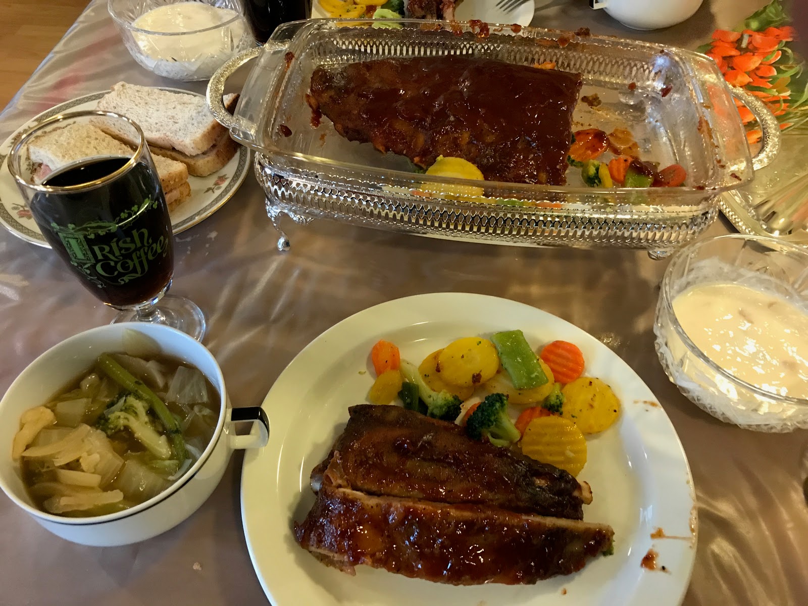 自炊の夕食は、オーブンも使ってスペアリブを温め、ミックスベジタブルを添えて、野菜のスープ、サンドイッチ、フルーチェ、ワインを加えた豪華版です。