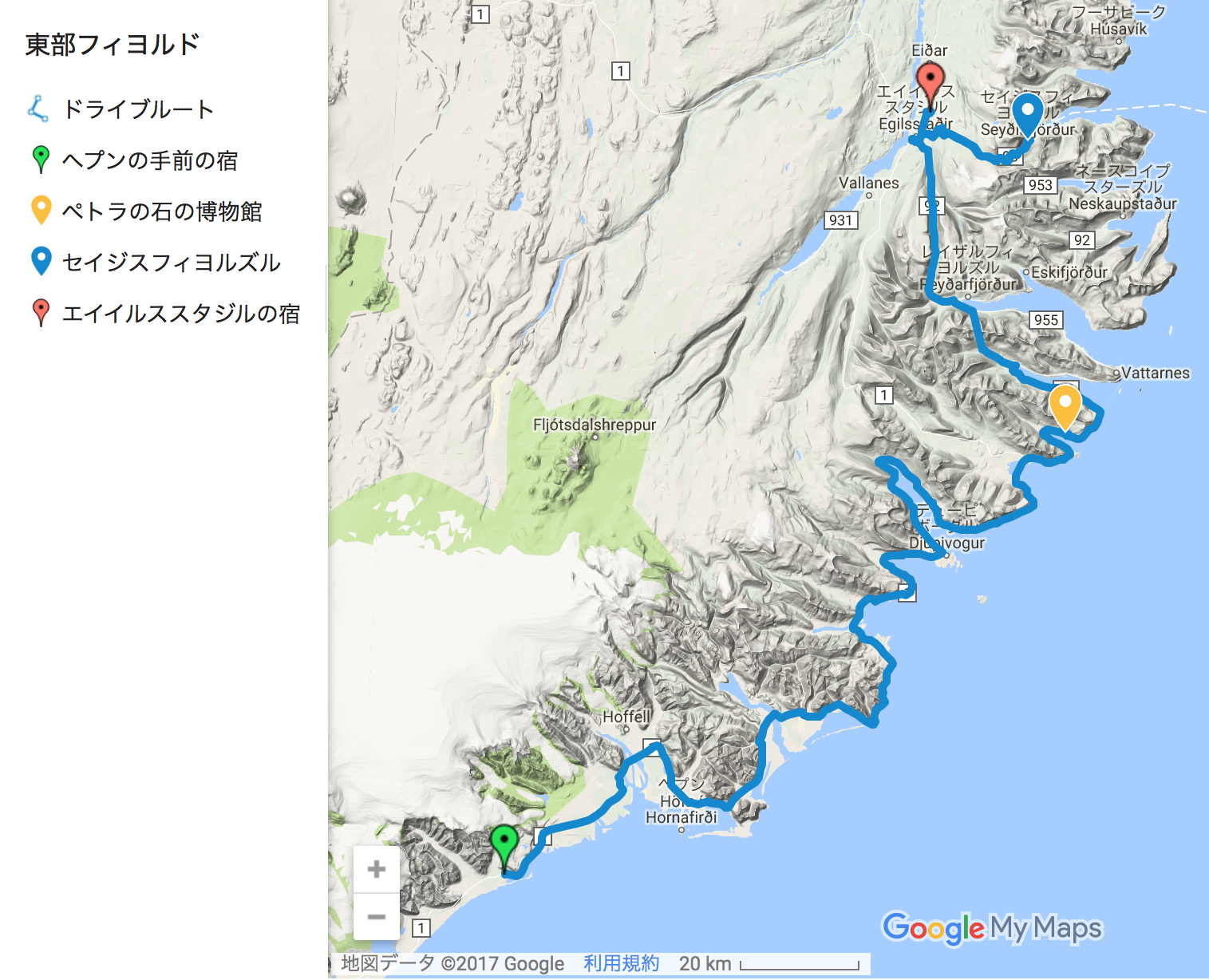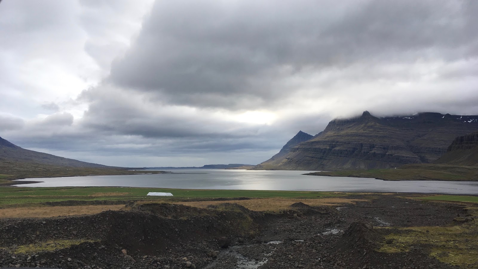 今日は移動日で、ひたすら景色の良い海岸沿いを北東に進みます。アイスランド東部のフィヨルド地帯に入ると、フィヨルド毎にずっと奥まで行って、また戻ってきてを繰り返します。写真は、一番深いフィヨルドの最奥部から入り口方向を眺めたものです。