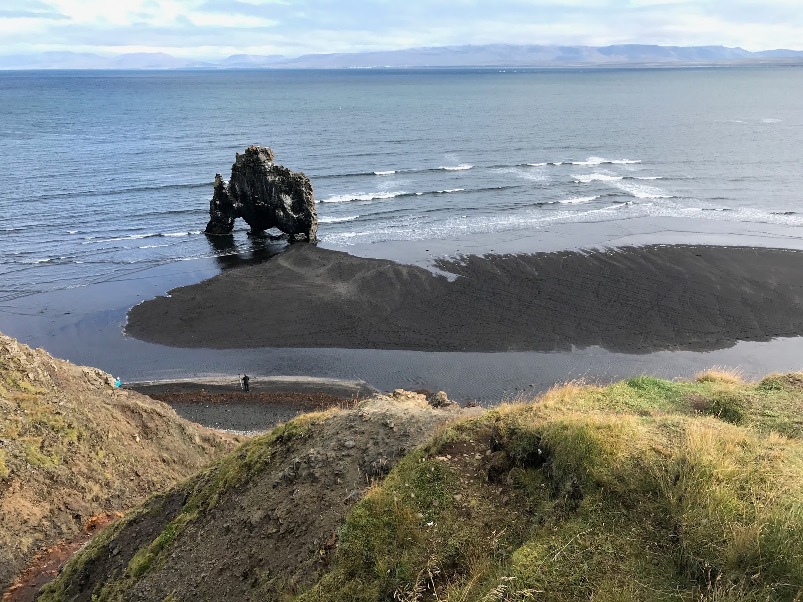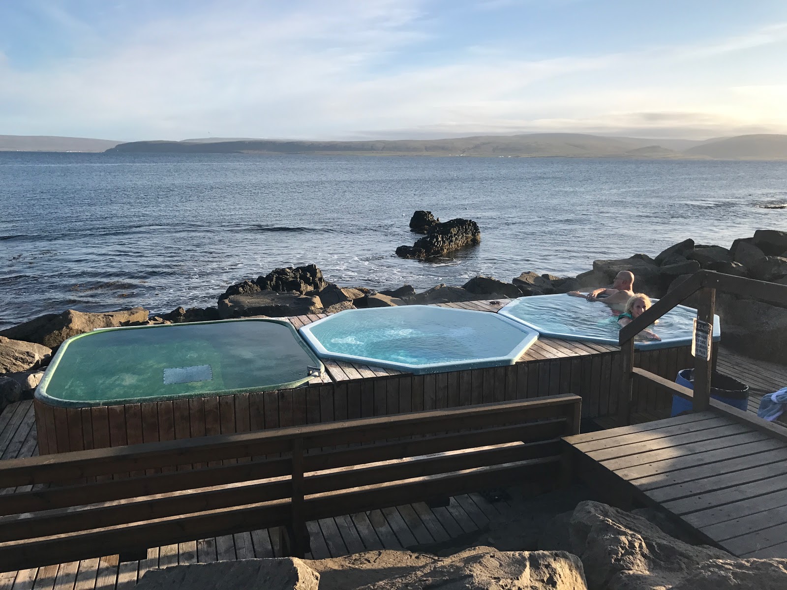 後は、半分近くは未舗装路をひたすら運転して、ホールマビークのホステルにチェックイン。部屋はドミトリーだけど、お客が少ないので一部屋貸切です。まだ夕食には早いので、30分ドライブして、ドラングネスの海岸際の温泉に行きました。無料のシャワーを浴びて、水着を着て、裸足で道路を渡ると、3つの温度のバスタブがあります。一番熱いのが、ちょうど良い感じでした。アイスランド名物の温泉にようやく入れました。