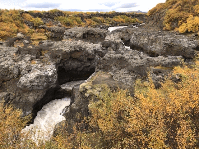 フロインフォッサルの滝は、よく整備された遊歩道を歩いてすぐでした。紅葉が始まっていて綺麗です。川が滝になって落ちるのではなく、崖の途中から水が湧き出したのが滝になっているのが珍しいです。迫力のある滝が多いアイスランドの中で、優美さの勝負ではナンバー1と思える美しい滝でした。
