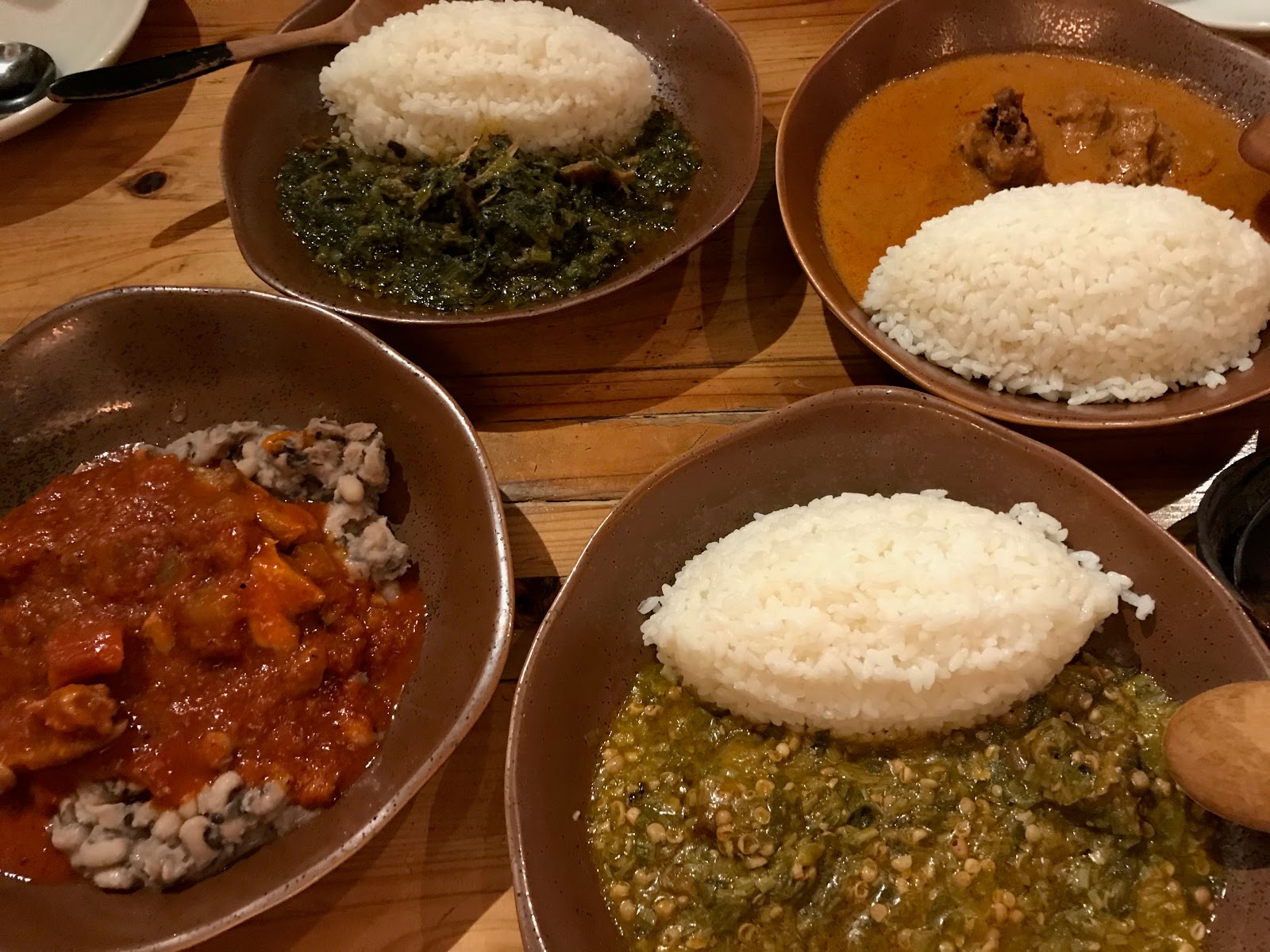 昼食は、浜松町の「カラバッシュ」というお店でアフリカ料理! 下の写真の左上から時計回りに、