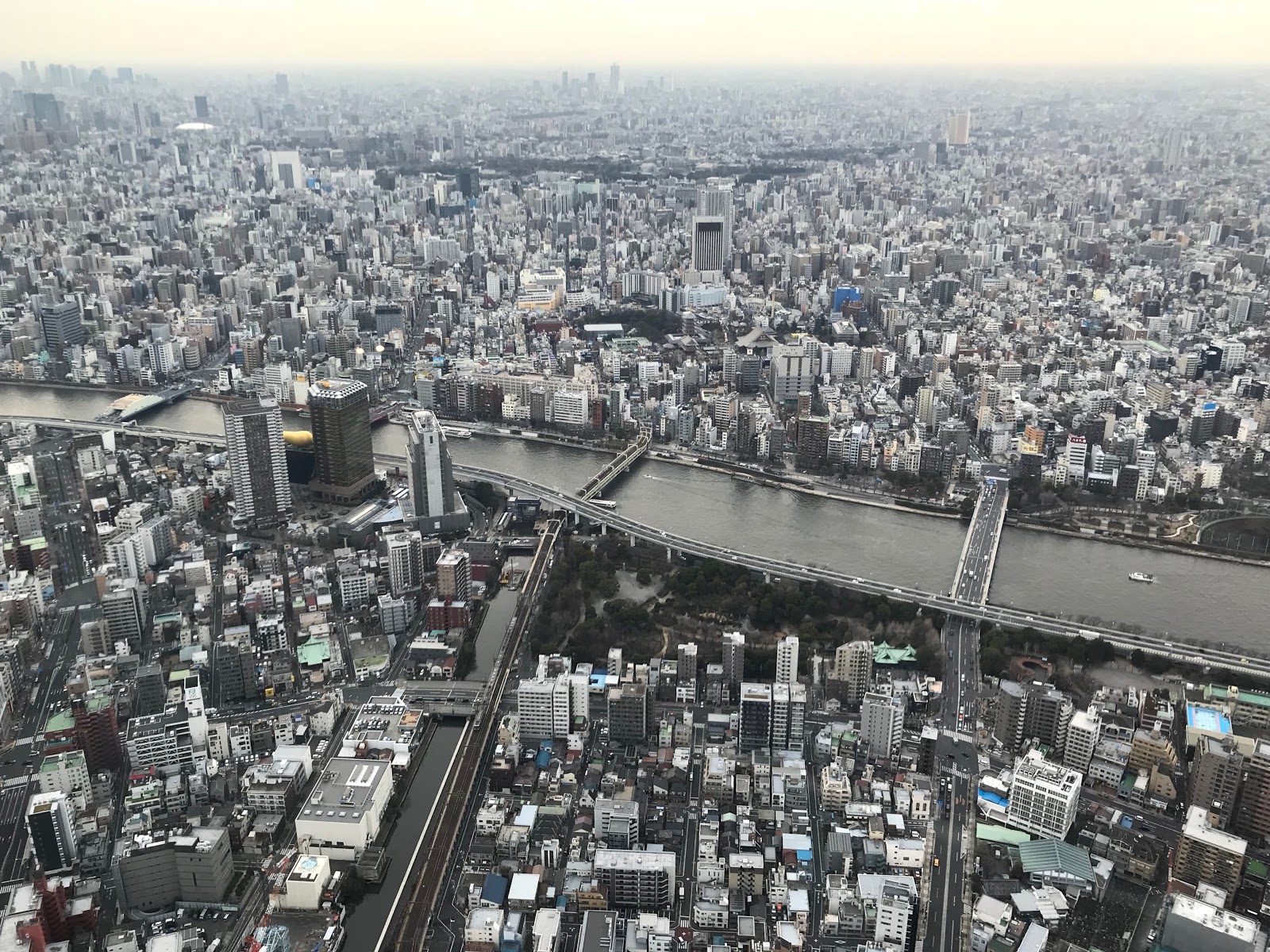 春がすみが少しかかっていたので、山は見えませんでしたが、かえって、平坦な土地にどこまでもびっしりと都会が広がっているところだけが見えたので、それはそれで一番東京らしい景色でした。