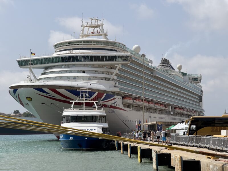 人気の寄港地なので、今日も複数のクルーズ船が同時に寄港します。先に入港していたP&Oアズーラ(11.5万トン)が、すぐ隣に接岸していました。
