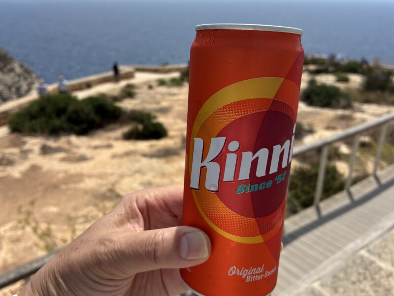 ドライバーと道中いろいろ会話する中で、マルタのソフトドリンクでオレンジとレモンが入ったKinniと言うのがあると聞いていたのですが、展望台のワゴン店で売っていたので、€2.5で買って飲んでみました。