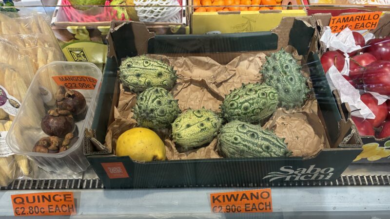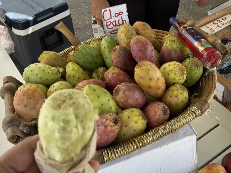 近くの売店でサボテンの実が1個€1で売っていて、その場で皮を剥いてくれるのを食べてみました。固い種もそのまま飲みこんで構わないそうです。