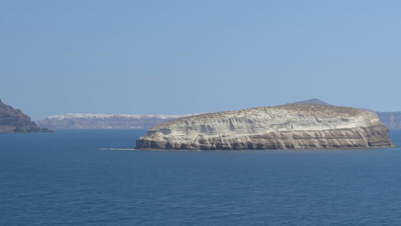 その奥のサントリーニ島の崖の上には、まるで白い雪が積もっているように見えます。
