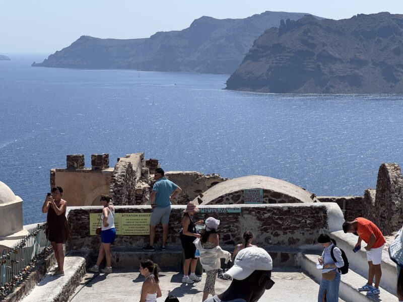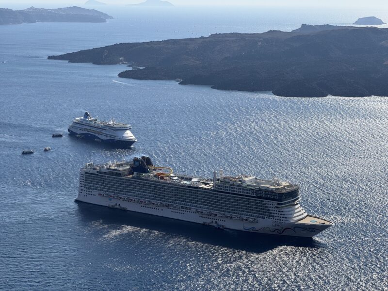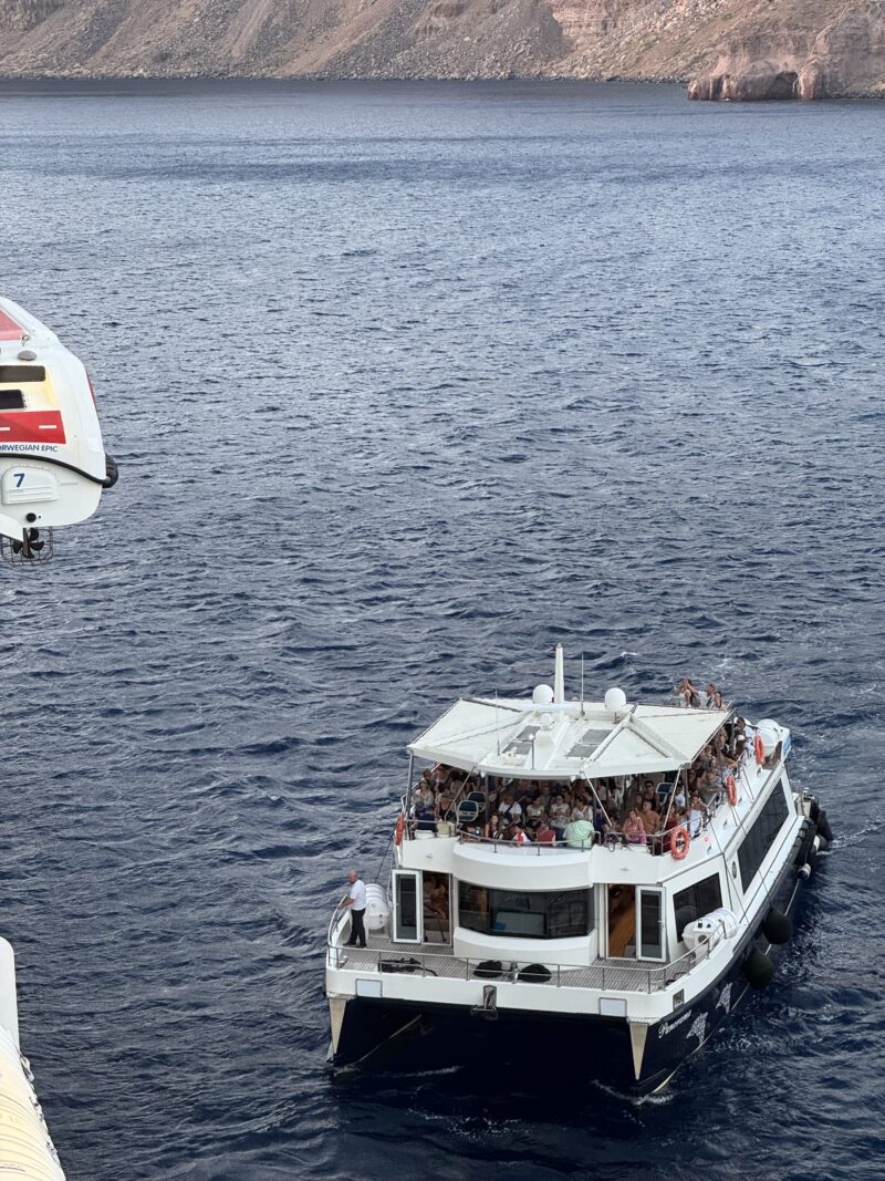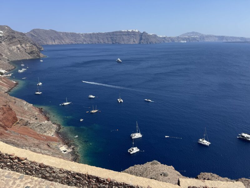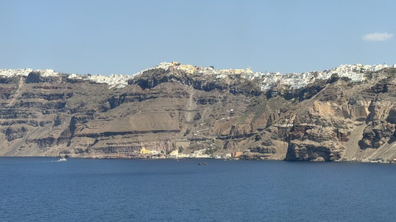 紺碧の海にはたくさんのヨットが浮かび、奥の崖の上には白いフィラの街、そして錨泊中のノルウェージャン・エピックも見えています。