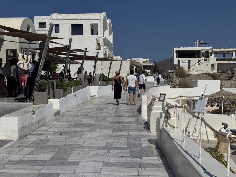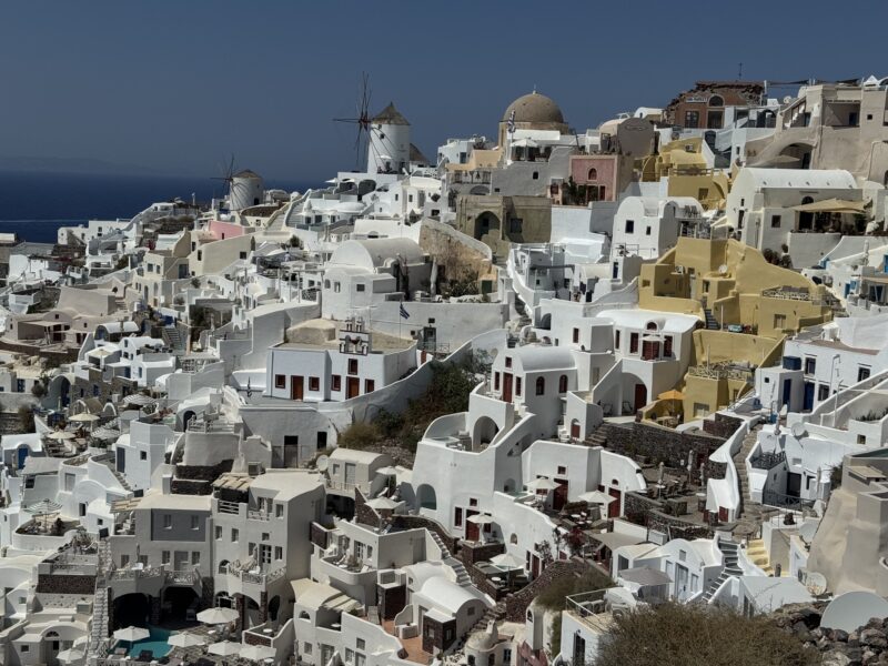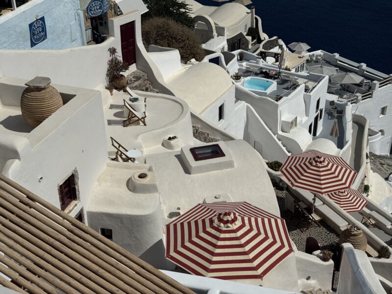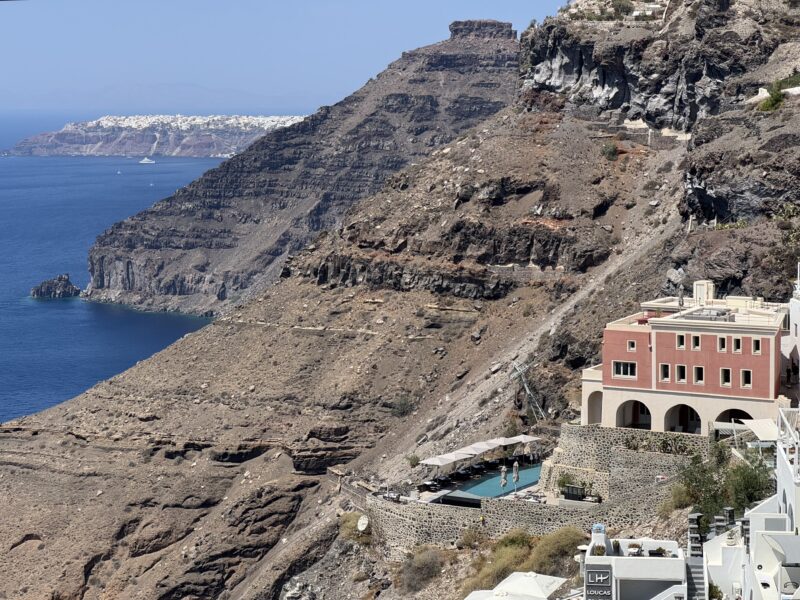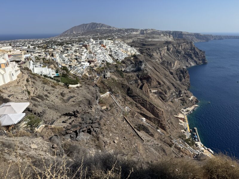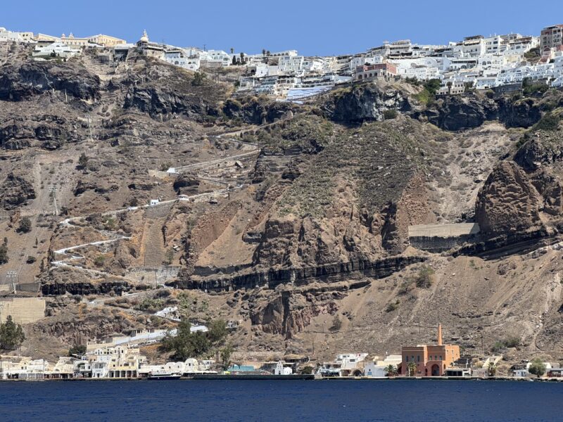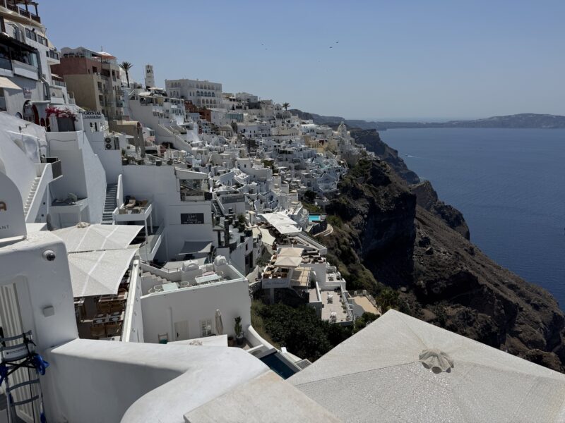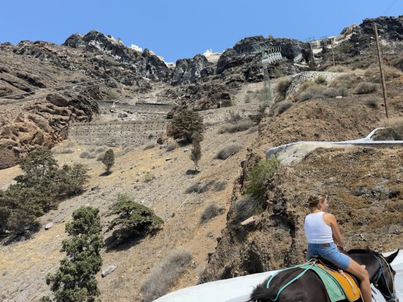 ロバは最後までは登らず、街の一番下あたりから最後の数十段は自分で歩いて登りましたが、崖の縁にへばりつくように建てられた白い家々が、サントリーニ島ならではのユニークな眺めでした。