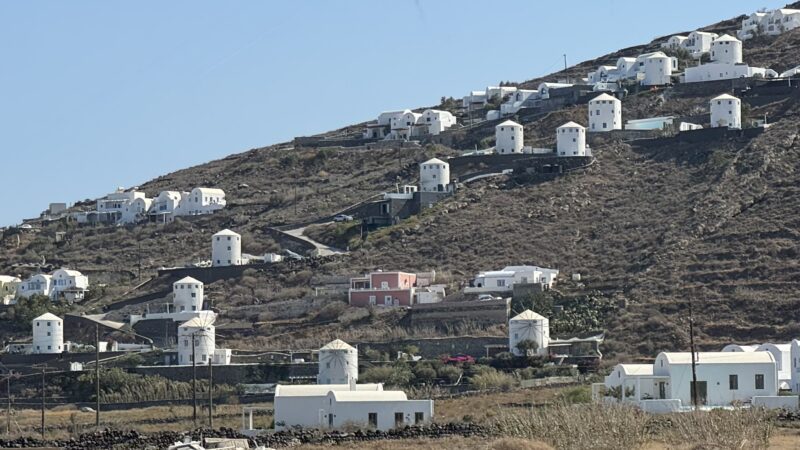 バスはすぐに出発し、フィラの街を抜けると、たくさんの風車が斜面にびっしり建っていました。