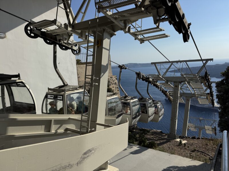 崖の上の街まで登って行く手段は、ケーブルカー(€10)、ロバ(€10)、徒歩(無料、580段)の3択です。船ではケーブルカーを推奨していますが、妻は学生時代に夜遅く着いて乗れなかったロバが心残りで今回は絶対にロバに乗ると決めています。