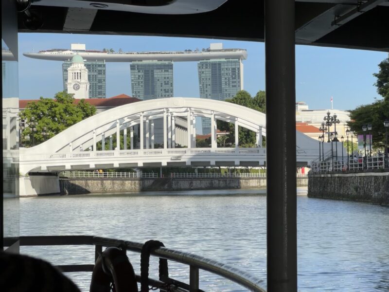 いくつも橋をくぐりながらシンガポール川を下り、マリーナベイに向かいます。