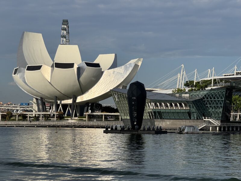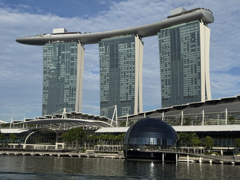 今は、その対岸にマリーナベイ・サンズ(ホテル)、ショップス・アット・マリーナベイ・サンズ(ショッピングモール)、ドーム型のアップルストアが建ち並び、隔世の感があります。