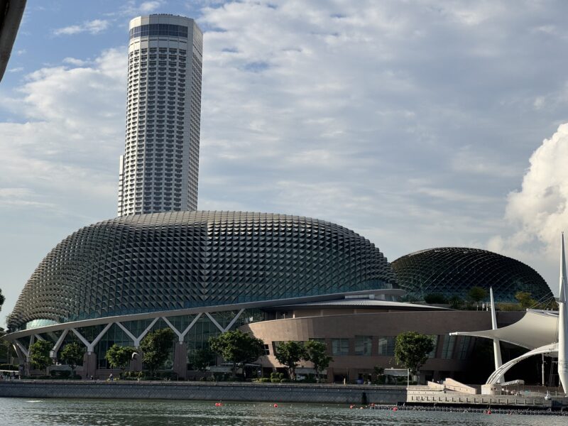 マリーナベイを一周し終わって、またシンガポール川に入る手前右側は、果物のドリアンに似た形のコンサートホール「エスプラネード・シアターズ・オン・ザ・ベイ」です。