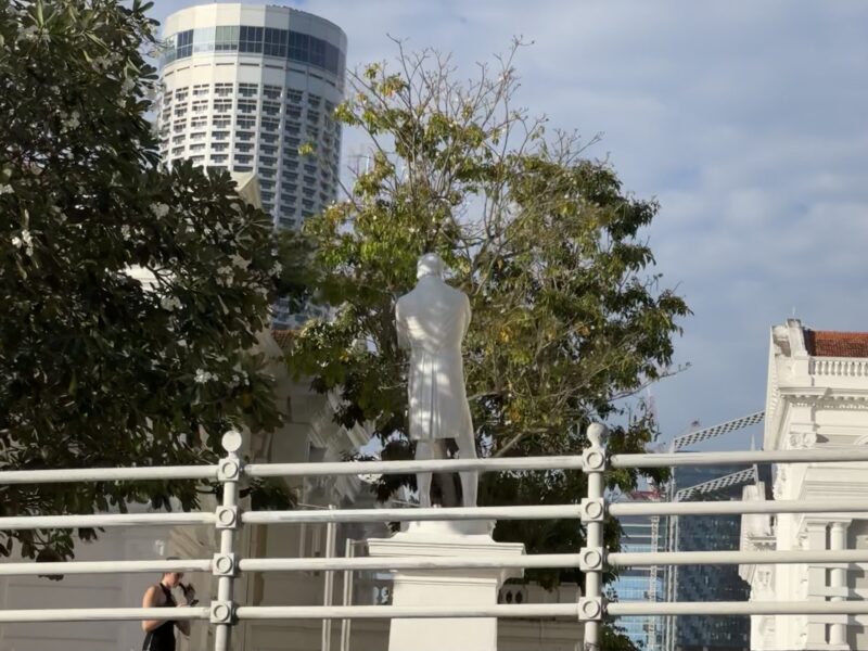 川を遡って行く途中、近代シンガポールの礎を築いた英国人ラッフルズの像の後ろ姿が見えました。
