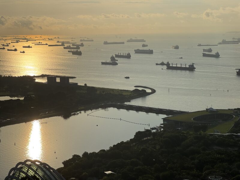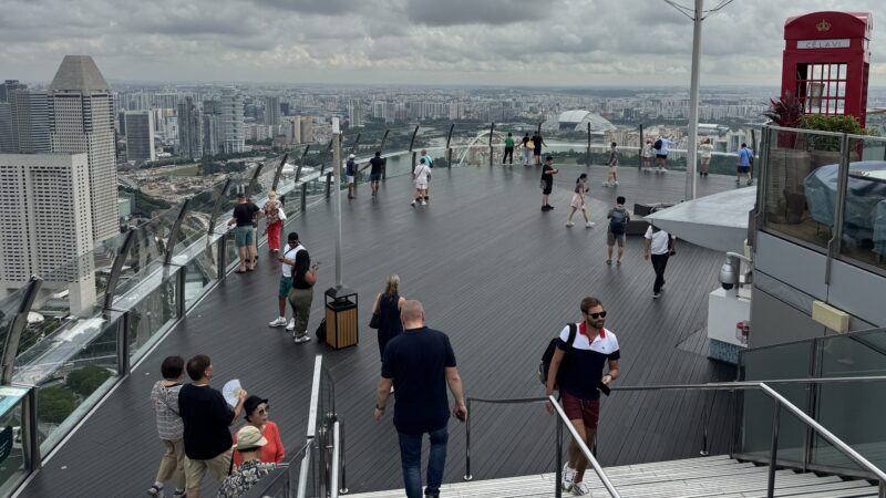 ほぼ一番高い所まで来た時に撮った写真です。左端が横から見たマリーナベイ・サンズ、その右側の白いのはショッピング・モール「ショップス・アット・マリーナベイ・サンズ」の屋根です。